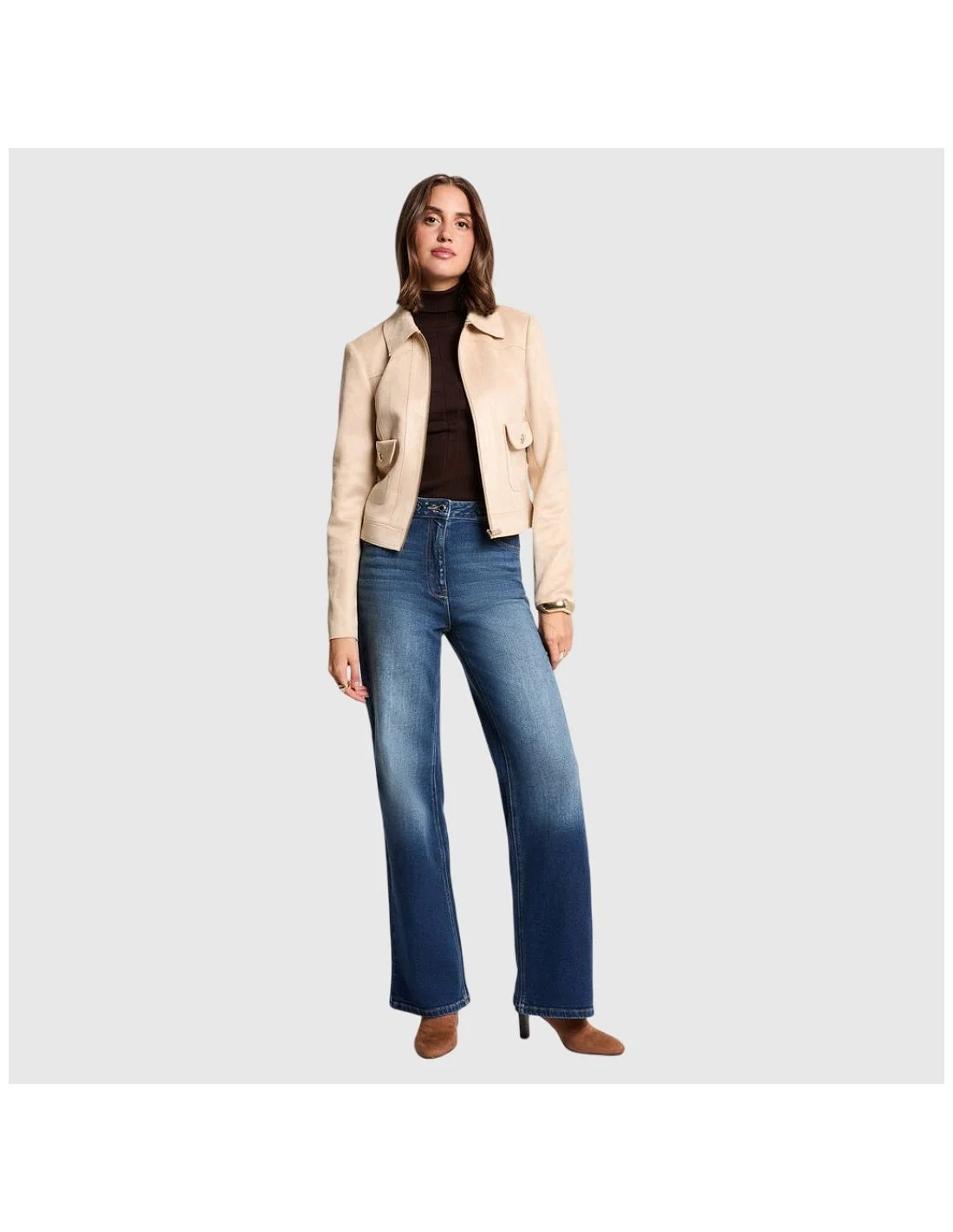 Chaqueta de mujer de la marca Morgan con un diseño elegante y estructurado. Presenta corte entallado y corto, cierre frontal con cremallera y solapa clásica. Incluye dos bolsillos delanteros con solapa y botón decorativo, aportando un toque sofisticado. Ideal para combinar con prendas casuales o de estilo más formal.