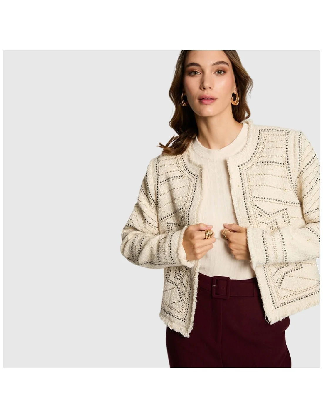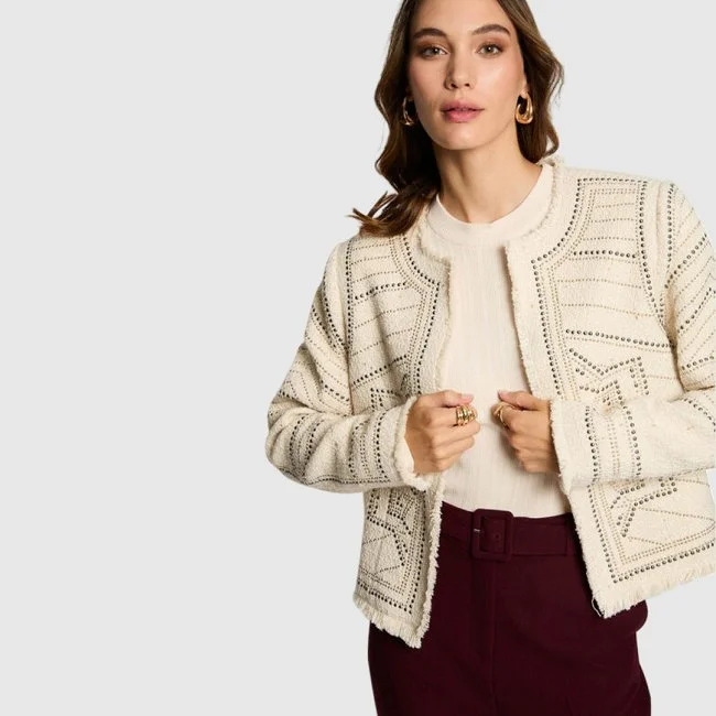 Chaqueta Morgan con diseño recto y corte corto. Confeccionada en tejido texturizado, destaca por sus detalles bordados con aplicaciones metálicas que dibujan un patrón geométrico. Presenta cuello redondo, acabado deshilachado en los bordes y cierre abierto sin botones. Una prenda sofisticada que aporta un toque elegante y moderno a cualquier look.