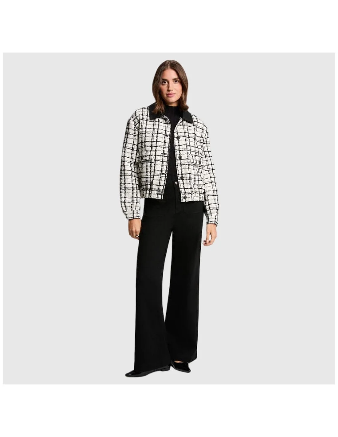 La chaqueta de Morgan presenta un diseño corto y estructurado con tejido tipo tweed de patrón a cuadros. Incluye cierre frontal con botones, bolsillos de solapa y cuello clásico en acabado efecto piel que aporta contraste y sofisticación. Su estilo elegante con inspiración vintage la convierte en una prenda ideal para looks urbanos o de oficina con un toque distintivo.