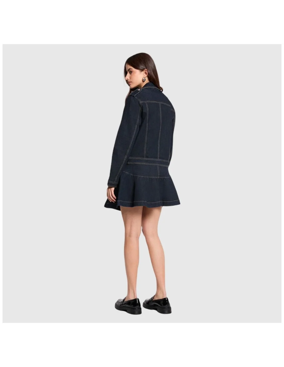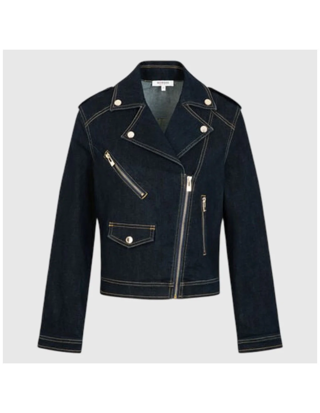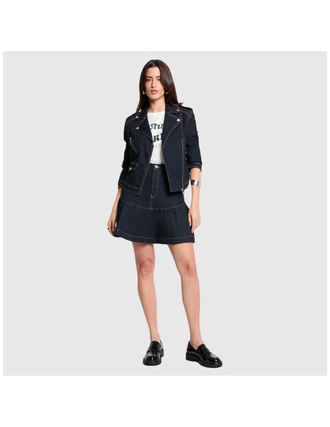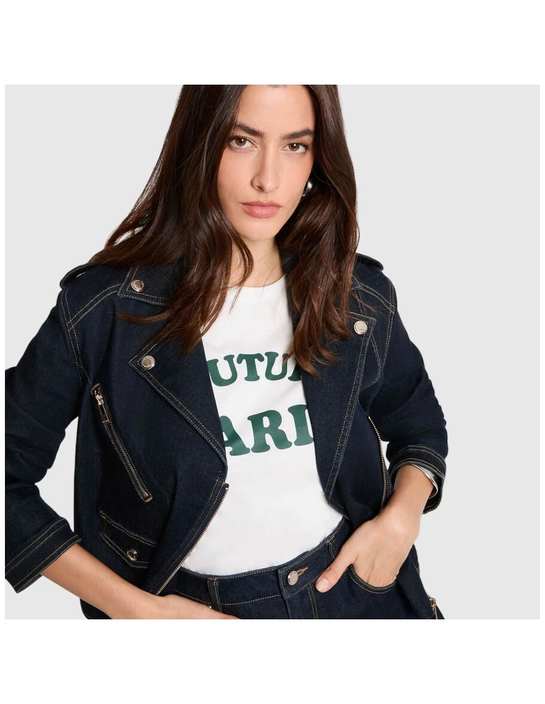 La chaqueta vaquera de Morgan ofrece un diseño tipo biker con cierre cruzado y cremalleras metálicas decorativas, aportando un toque moderno y estructurado. Confeccionada en denim con costuras contrastantes, combina estilo urbano y actitud sofisticada. Su corte ajustado y detalles como solapas y bolsillos frontales la hacen ideal para looks casuales o semi-formales con personalidad.