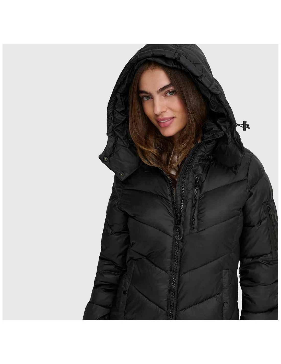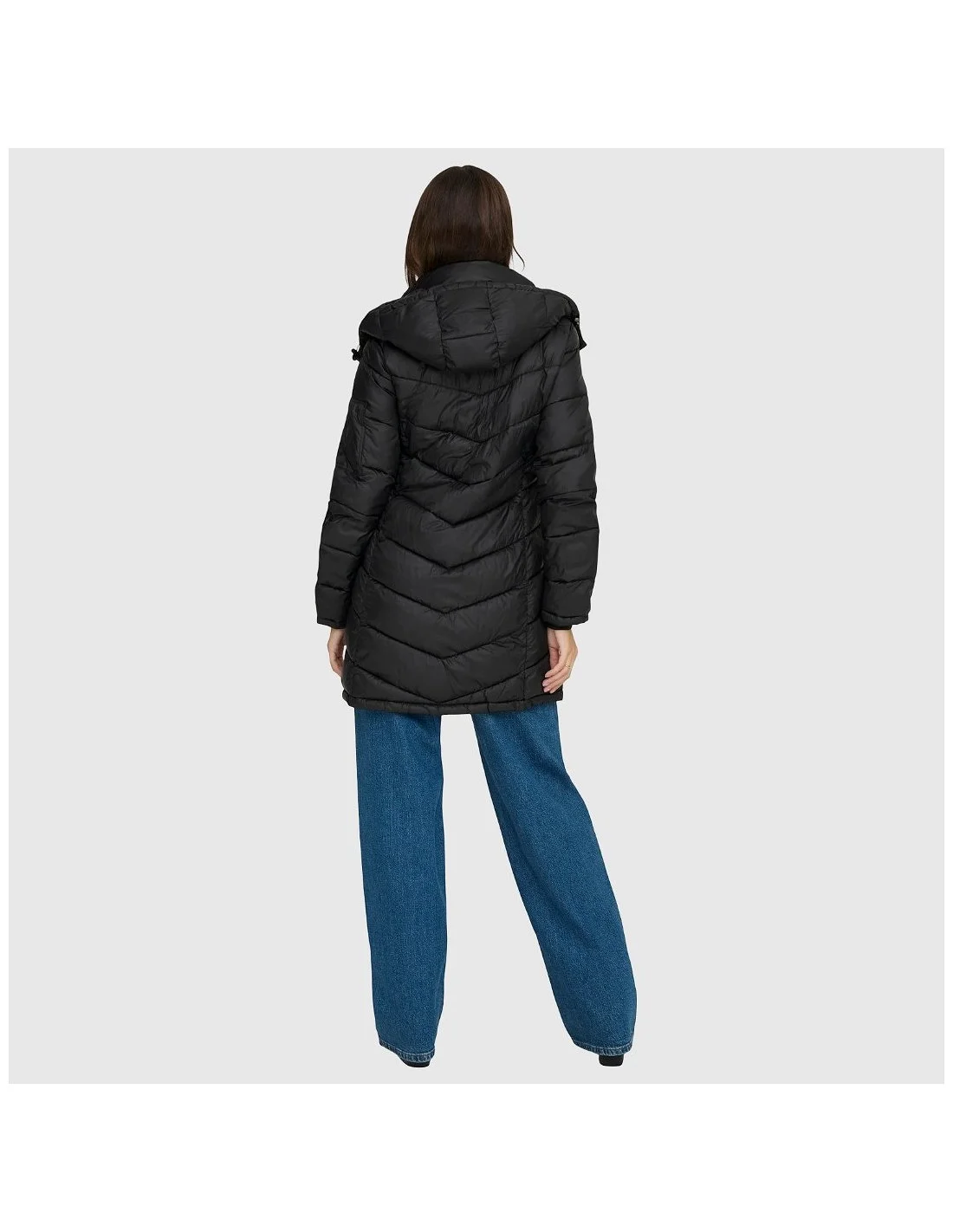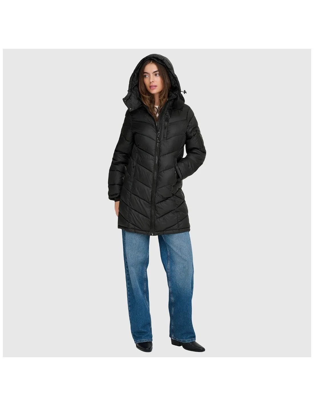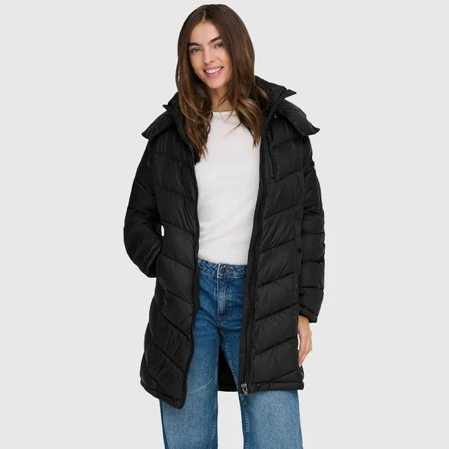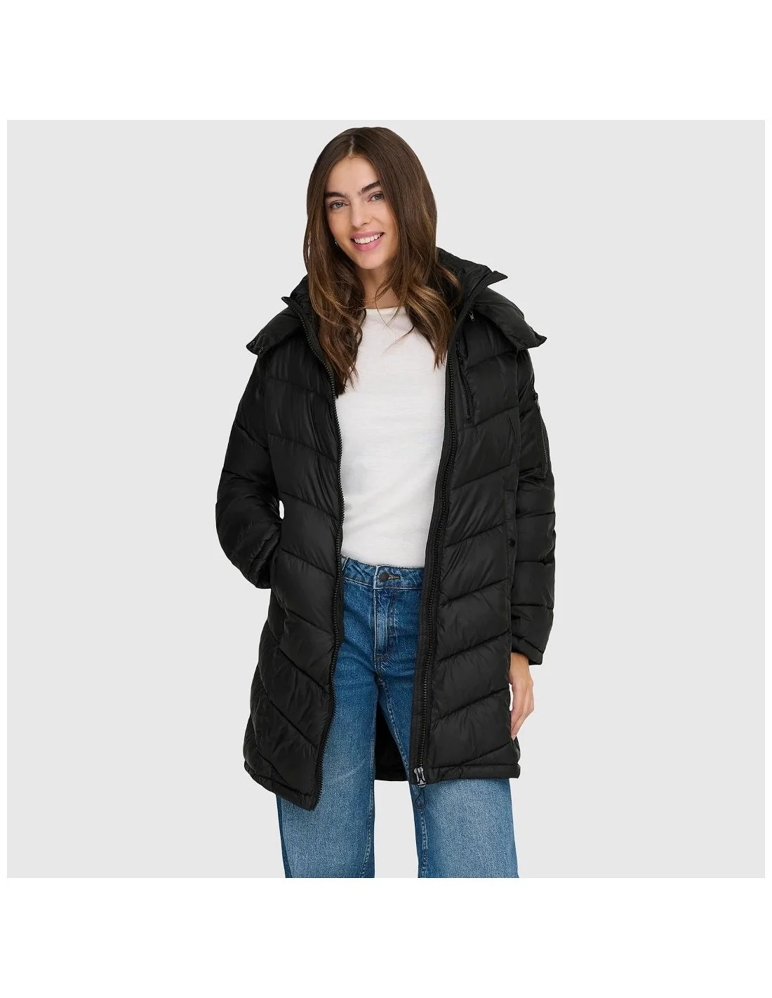 La chaqueta larga de ONLY destaca por su diseño acolchado con costuras en zigzag que aportan textura y estilo. Incorpora capucha ajustable, cierre frontal de doble cremallera y bolsillos funcionales, incluido uno en la manga. Su corte recto y material sintético la convierten en una opción práctica y moderna para el uso diario en climas fríos.