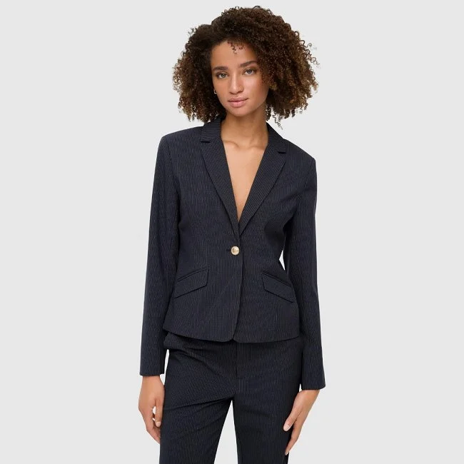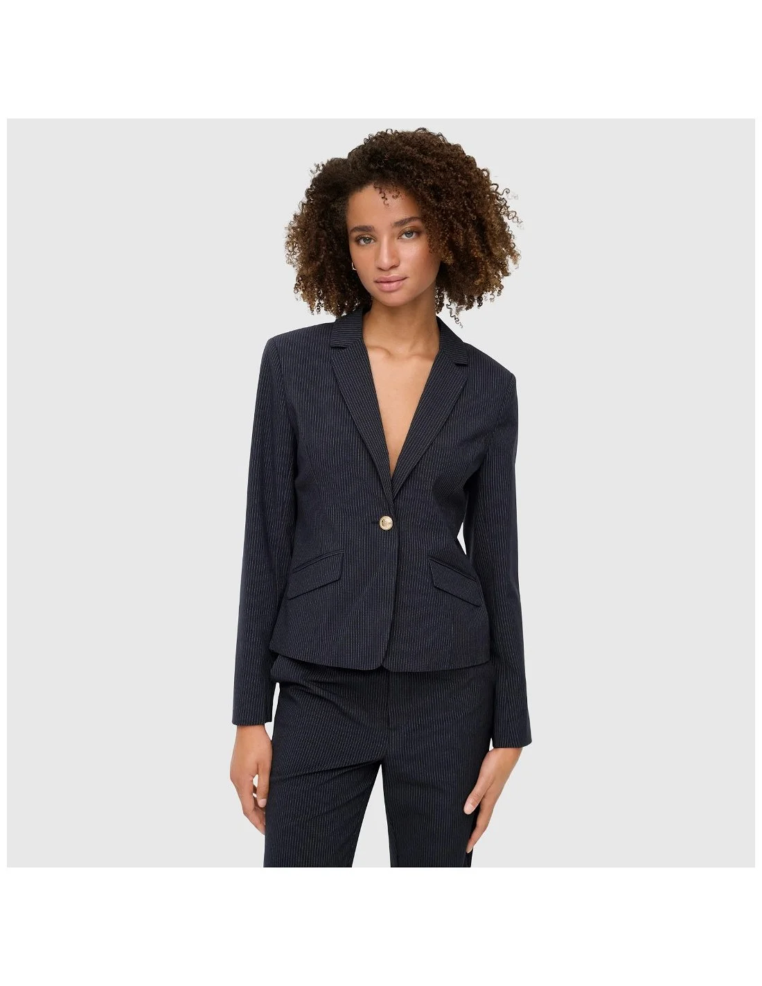 La chaqueta de traje para mujer de ONLY ofrece un diseño entallado que realza la silueta con elegancia. Su patrón de finas rayas en azul marino y el cierre con botón dorado aportan un toque sofisticado y profesional. Ideal para entornos formales o de oficina, incorpora bolsillos con solapa y solapas clásicas que completan un look pulido y actual.