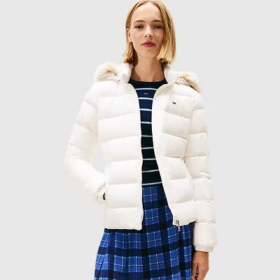 Chaqueta acolchada de Tommy Hilfiger con capucha extraíble y borde de pelo sintético. Presenta cierre de cremallera, bolsillos laterales y puños elásticos para mayor comodidad. Incluye el logotipo bordado en el pecho, ofreciendo un diseño funcional y moderno ideal para los días fríos.