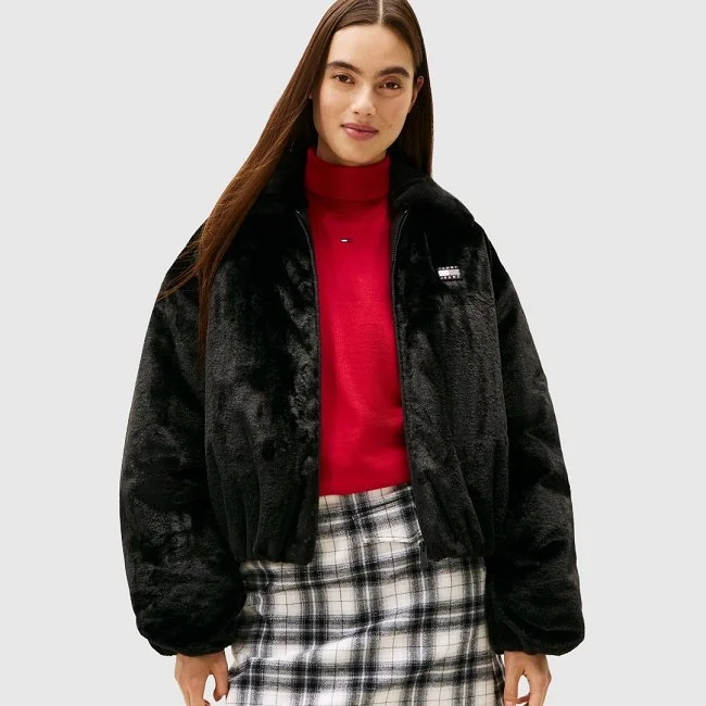 Chaqueta Tommy Jeans de pelo sintético con cremallera frontal y bolsillos laterales. Presenta cuello subido y el logo de la marca en el pecho. Una prenda cálida y con estilo, ideal para completar looks modernos y casuales.