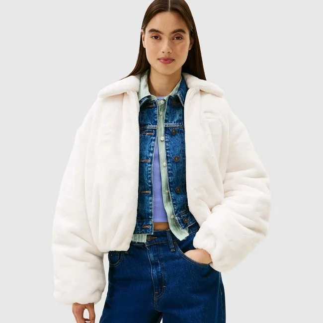 Chaqueta Tommy Jeans de pelo sintético con cremallera frontal y bolsillos laterales. Presenta cuello subido y el logo de la marca en el pecho. Una prenda cálida y con estilo, ideal para completar looks modernos y casuales.