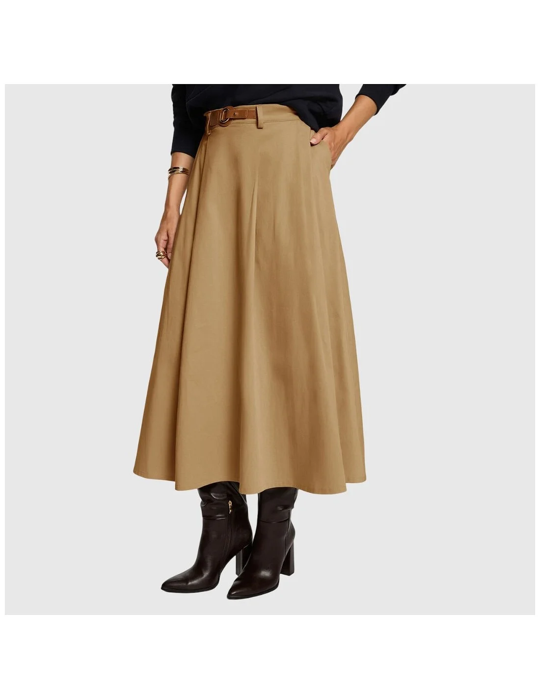 La falda midi de tiro alto Morgan combina elegancia y versatilidad. Con un diseño evasé en tono camel y pliegues sutiles al frente, aporta movimiento y estilo. Incorpora un cinturón a juego con hebilla metálica que define la cintura con sofisticación. Ideal para looks casuales o de oficina, se adapta con facilidad a distintas ocasiones.