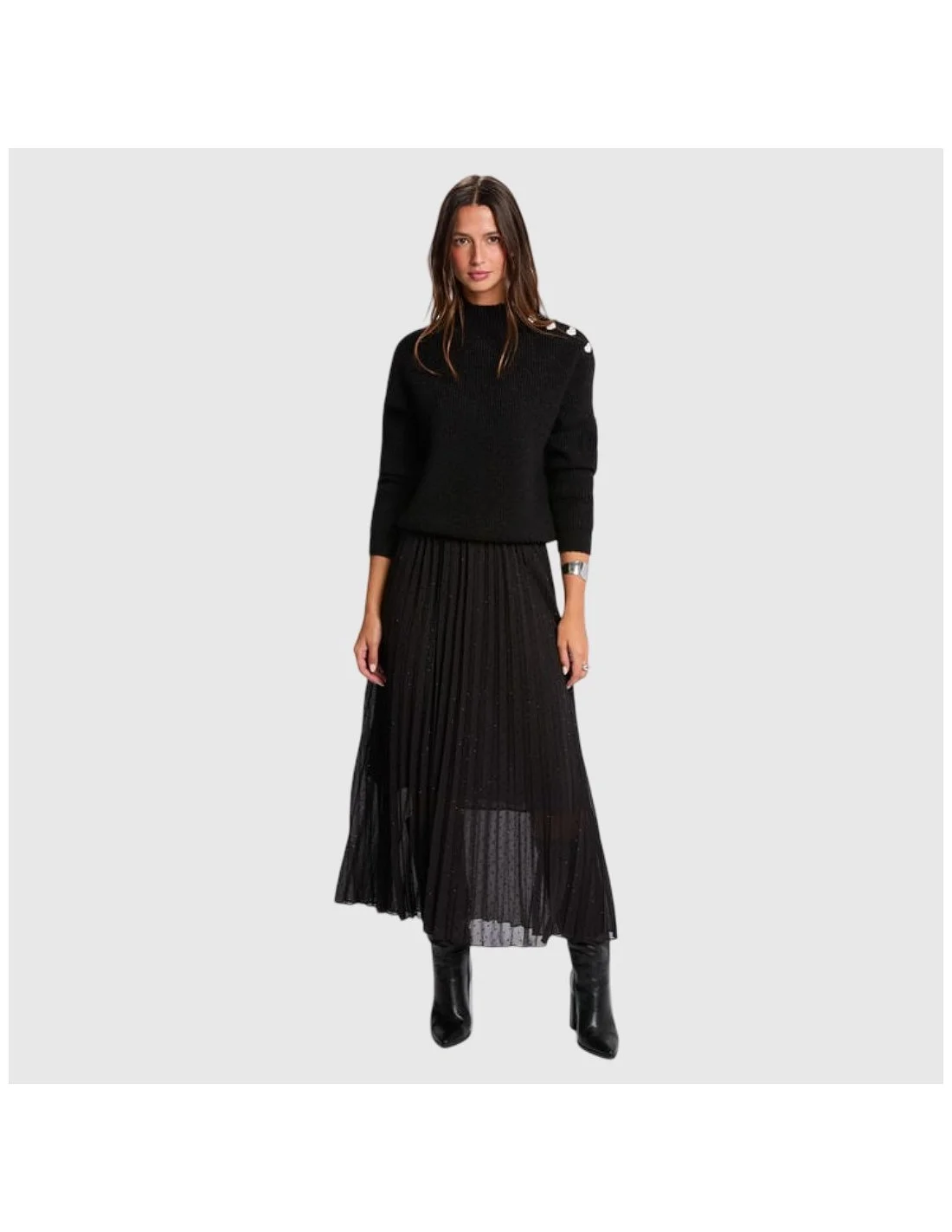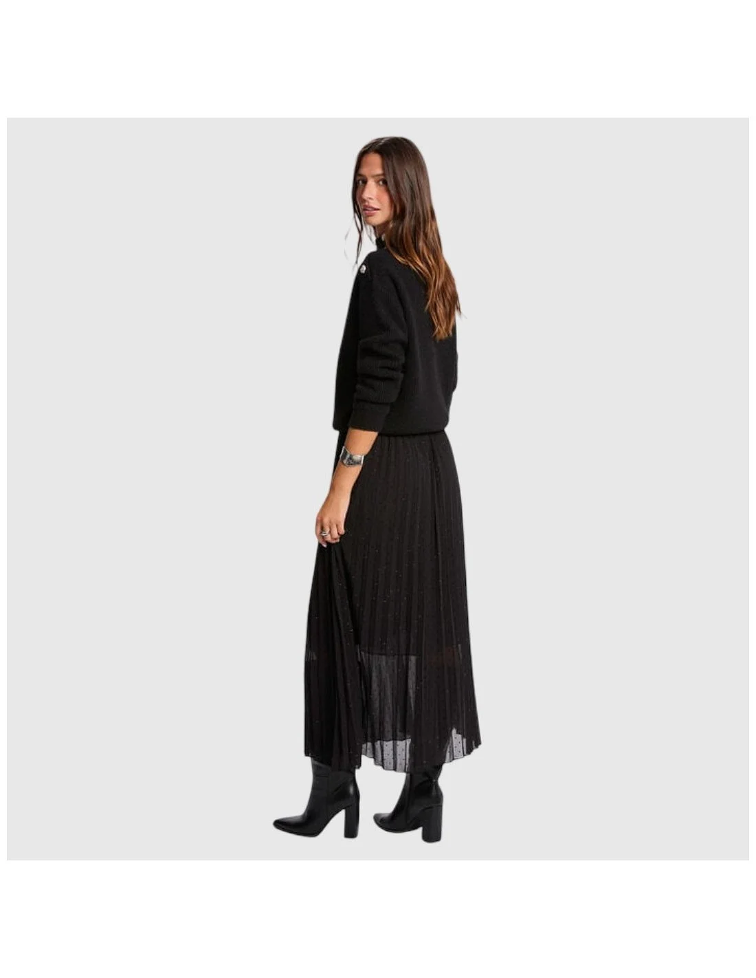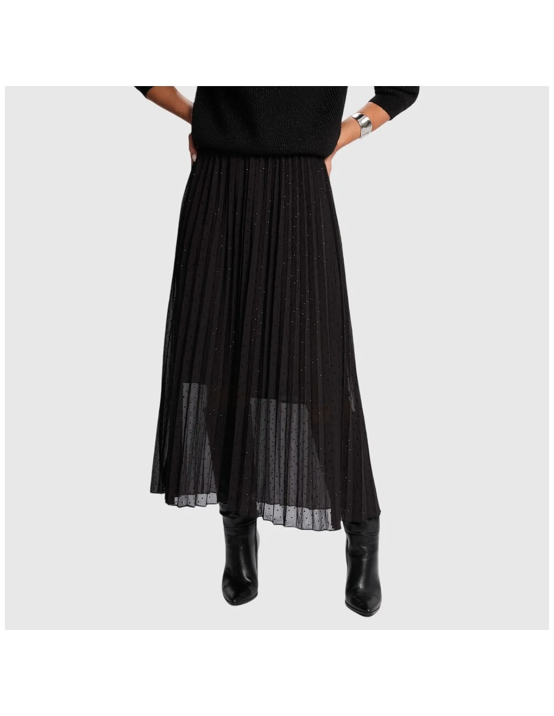 La falda Morgan es una prenda midi plisada en color negro con sutiles aplicaciones brillantes que aportan un acabado sofisticado. Confeccionada en tejido ligero y semitransparente, incorpora forro interior para mayor comodidad. Su diseño vaporoso y versátil la hace ideal para looks urbanos o combinaciones más elegantes.