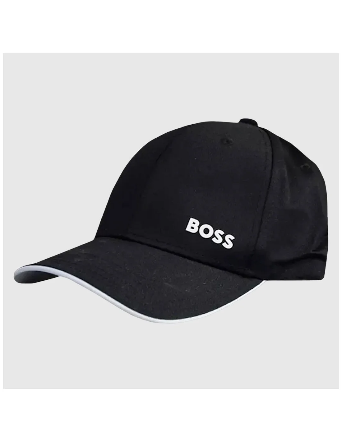 Gorra BOSS con diseño clásico de seis paneles y visera curva. Presenta el logo de la marca en la parte frontal y un ribete contrastante en la visera. Cuenta con una correa ajustable con hebilla metálica en la parte trasera para un ajuste personalizado. Ideal para un look casual y moderno.