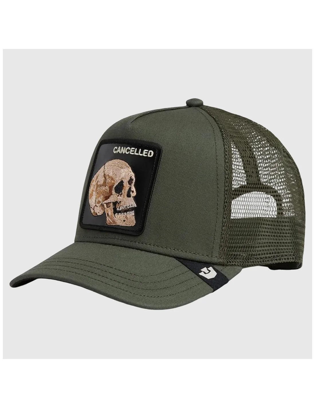 La gorra Goorin Bros Cancelled en color verde oliva combina diseño trucker y estética urbana con un parche frontal de calavera que aporta carácter. Su estructura clásica y ajuste cómodo la convierten en una opción versátil para uso diario unisex.