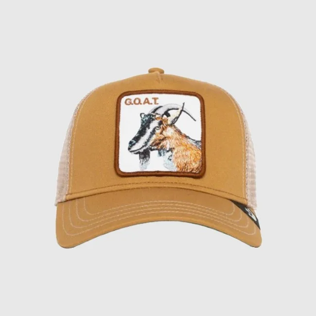 La gorra GOAT de Goorin Bros. es un accesorio trucker con personalidad. Confeccionada en mezcla de algodón y poliéster, presenta un parche frontal bordado con una cabra y paneles traseros de malla beige para mayor ventilación. Su color camel y cierre snapback ajustable aportan comodidad y estilo informal. Ideal para looks urbanos o actividades al aire libre.