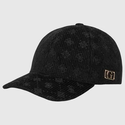Gorra Guess confeccionada en pana con textura acanalada y diseño de logotipos bordados por toda la superficie. Presenta visera curva, cierre trasero ajustable con detalle metálico grabado y placa con iniciales decorativas en un lateral. Un accesorio moderno que combina estilo casual y sofisticación.