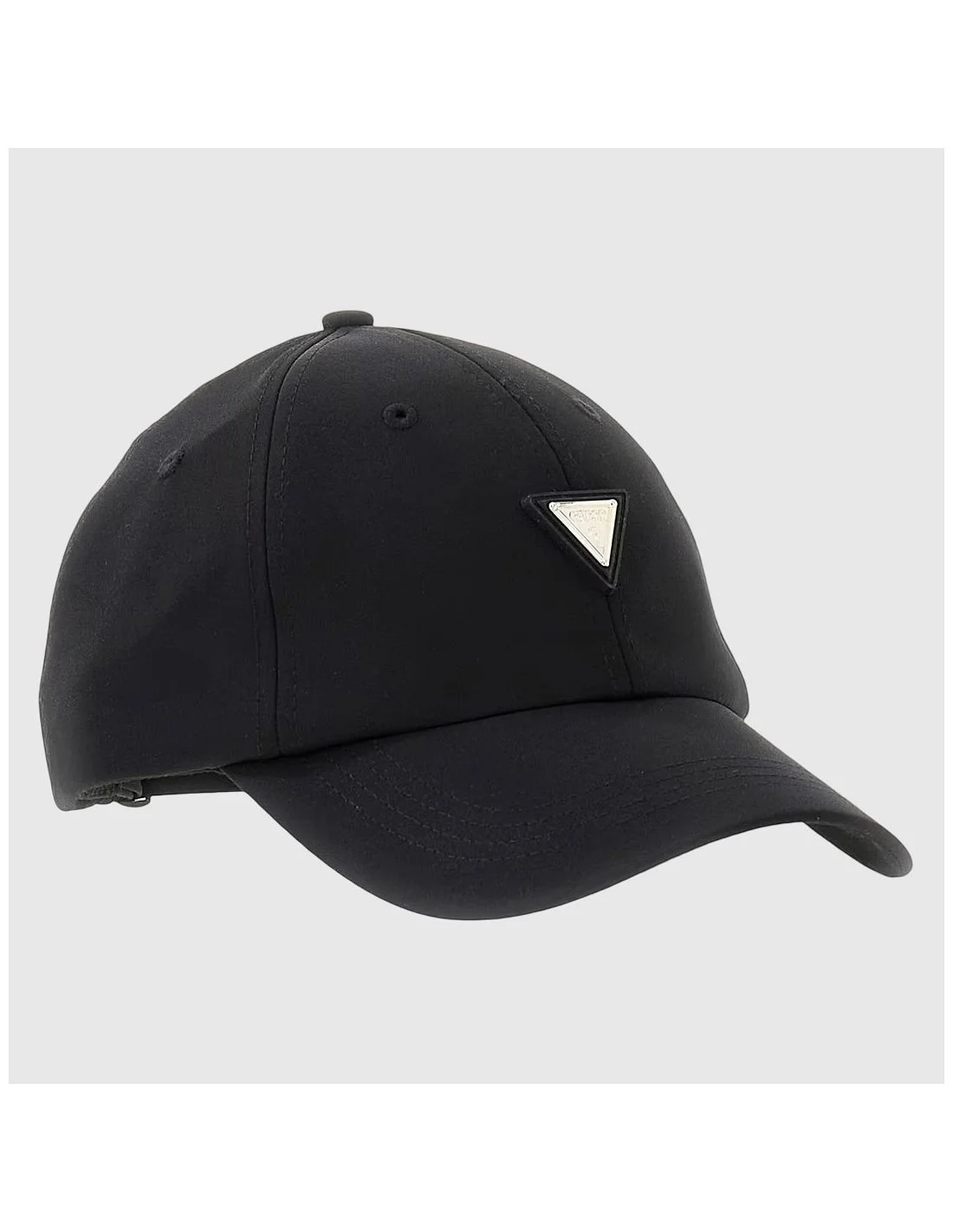 Gorra Guess con diseño clásico de seis paneles y visera curva. Incorpora el icónico logotipo metálico en forma de triángulo en la parte frontal y cierre ajustable con hebilla en la parte trasera. Ideal para complementar looks urbanos con un toque distintivo de la marca.