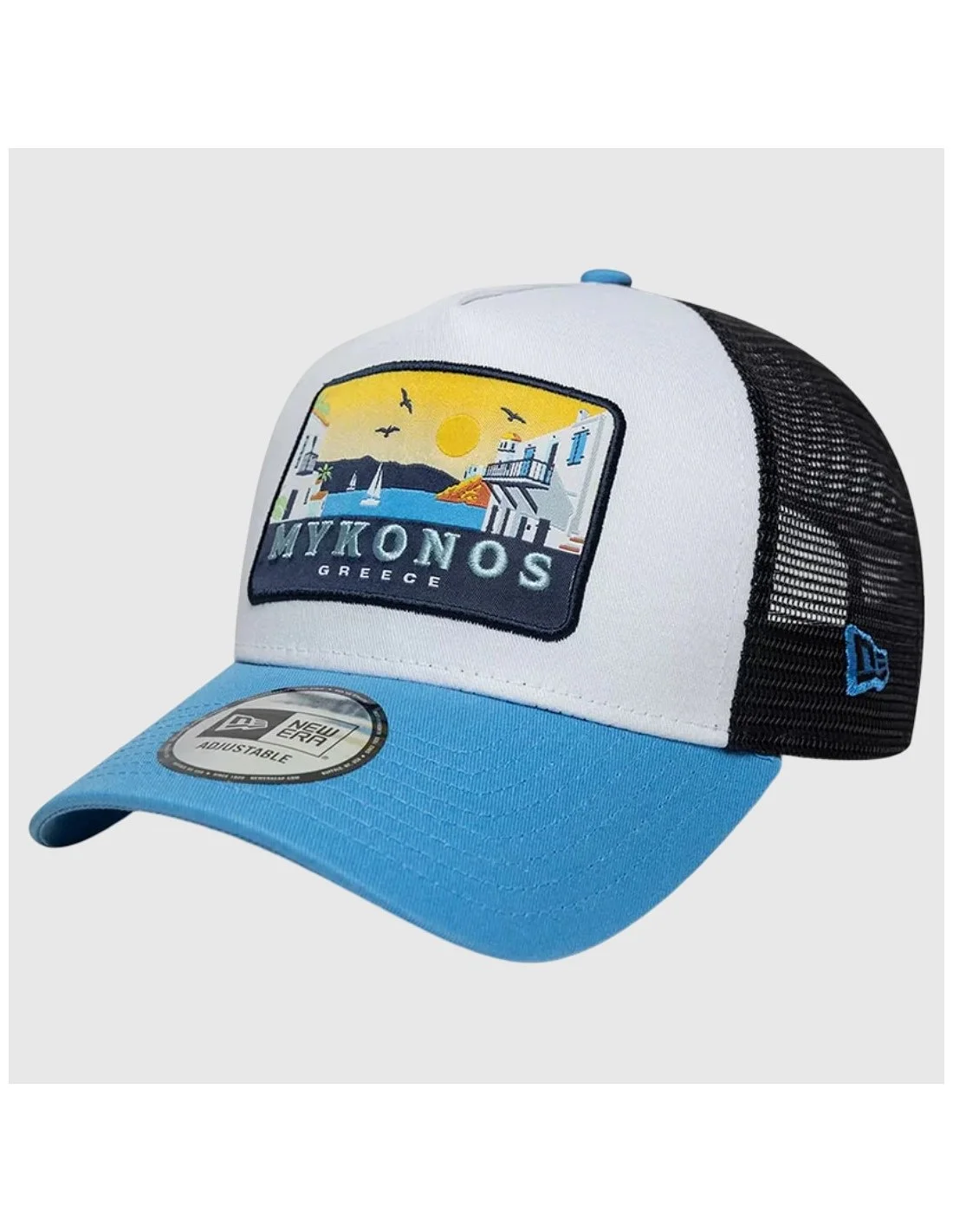 La gorra New Era unisex tipo trucker destaca por su parche frontal con diseño gráfico que aporta un estilo veraniego y urbano. Su estructura combina panel sólido delantero con malla trasera para mayor ligereza.