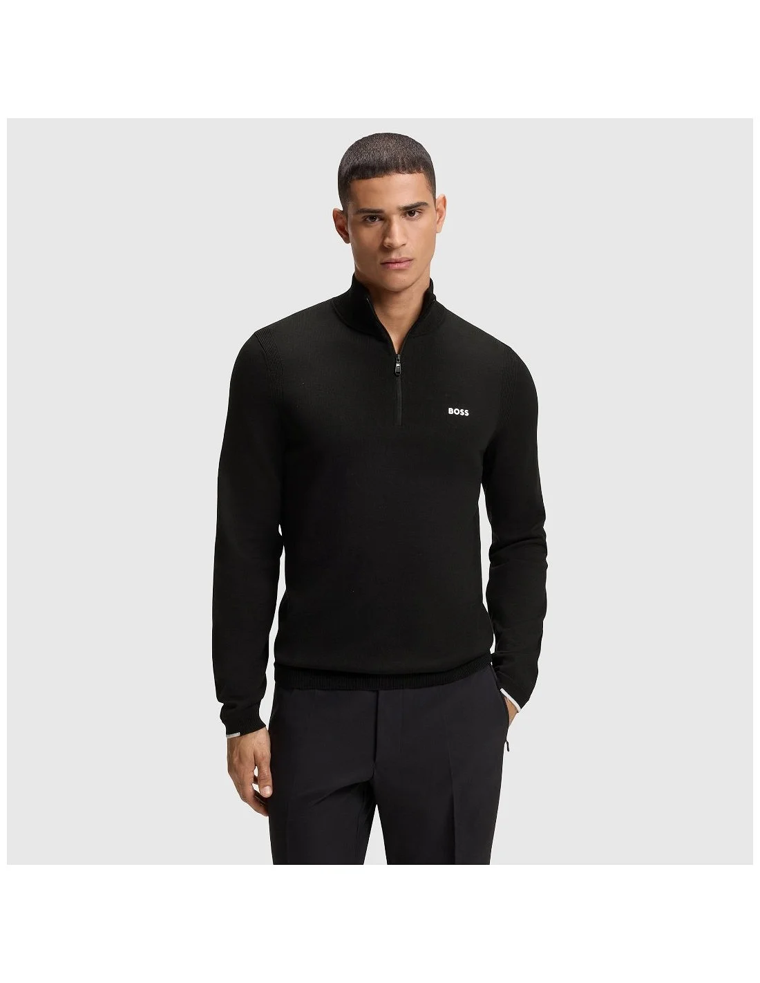 Jersey BOSS de punto fino con cremallera media y cuello alto. Presenta un diseño elegante y minimalista con el logotipo bordado en el pecho. Ideal para un look sofisticado y versátil.