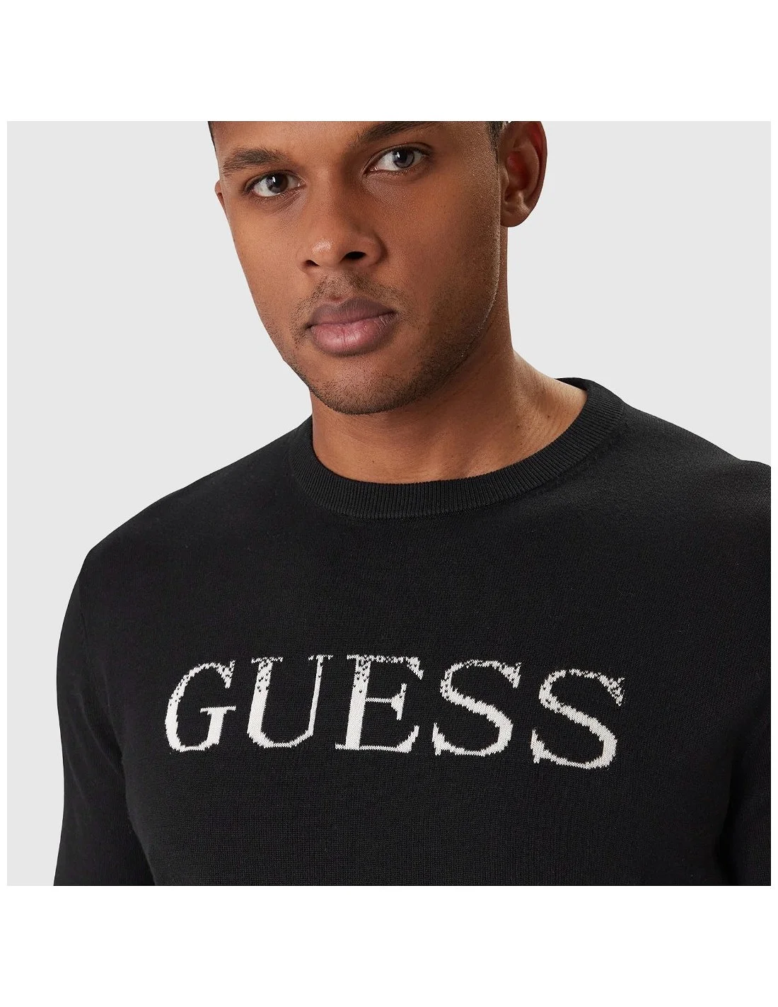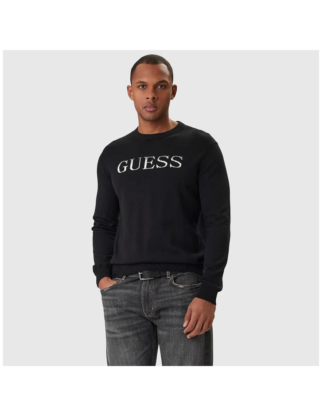 Jersey de hombre Guess de diseño clásico con cuello redondo y ajuste regular. Destaca por el logo de la marca tejido en la parte frontal con efecto desgastado, aportando un toque moderno y distintivo. Confeccionado en tejido de punto fino, es ideal para un estilo casual y versátil.