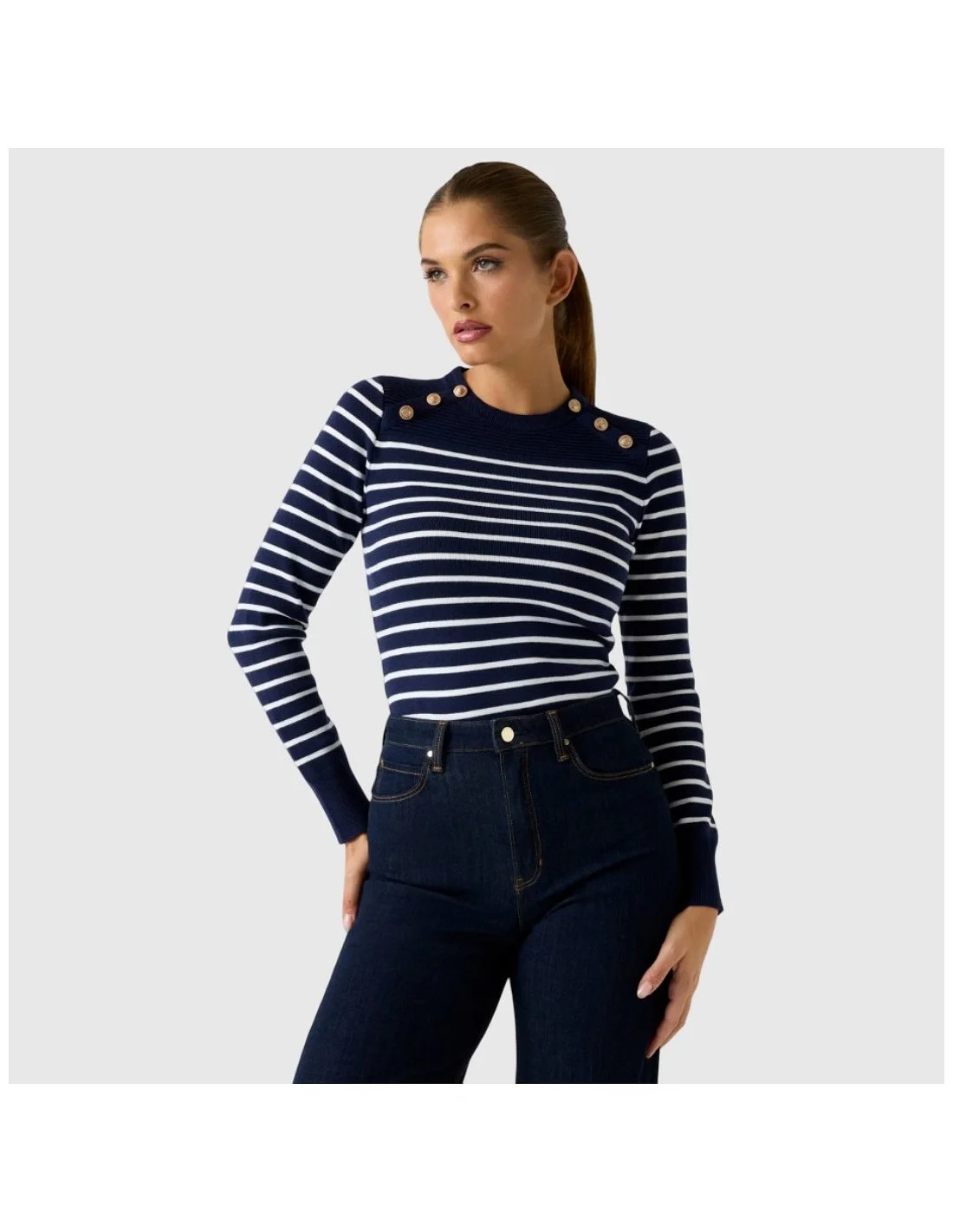 Jersey de Guess de estilo marinero con diseño de rayas horizontales. Presenta cuello redondo y manga larga, con detalle de botones metálicos decorativos en los hombros que aportan un toque sofisticado. Confeccionado en punto elástico, se ajusta cómodamente a la silueta, ideal para looks casuales y elegantes.