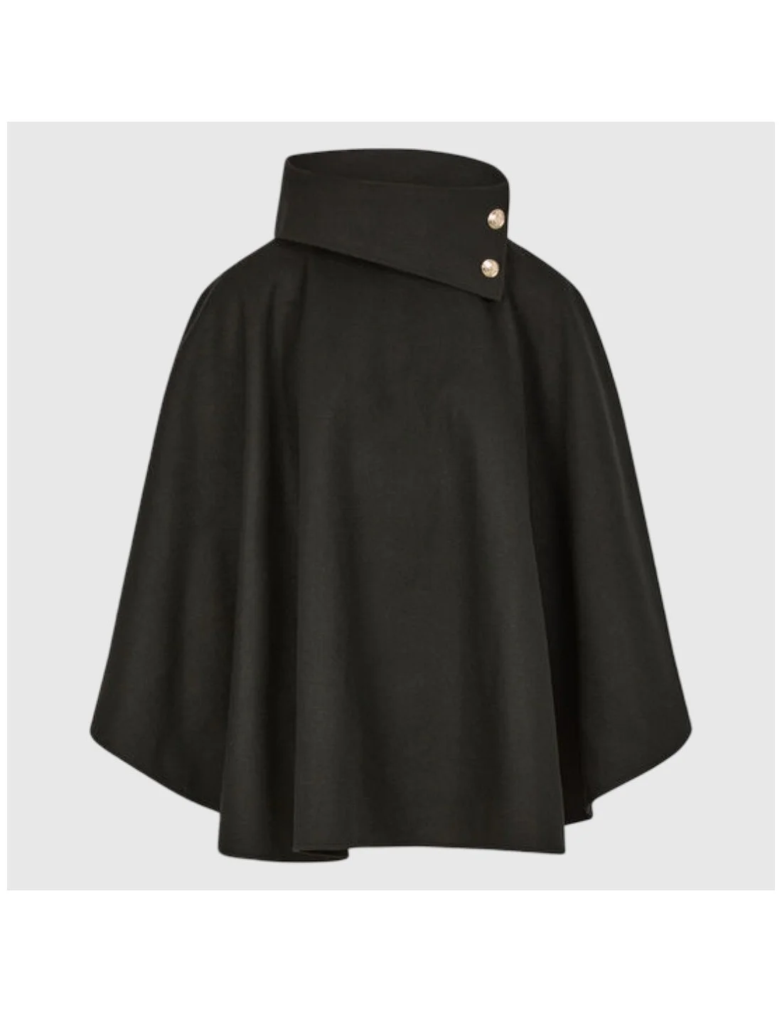 Poncho Morgan con diseño elegante y fluido. Presenta cuello alto asimétrico con cierre de botones metálicos decorativos y silueta amplia que aporta movimiento y sofisticación. Una prenda versátil ideal para elevar cualquier look con un toque chic y distinguido.