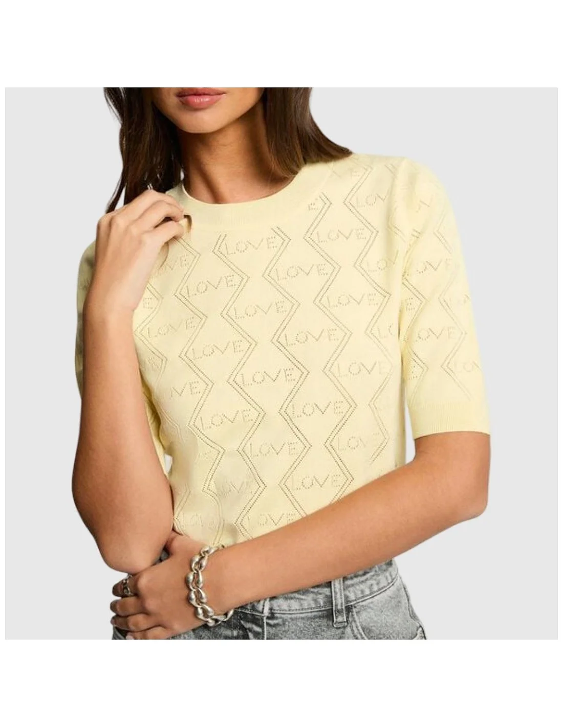 Jersey de punto fino en color azul pastel con manga corta y cuello redondo. Presenta un diseño calado en patrón geométrico con la palabra LOVE repetida, aportando un toque romántico y moderno al look. Ideal para combinar con prendas de talle alto.