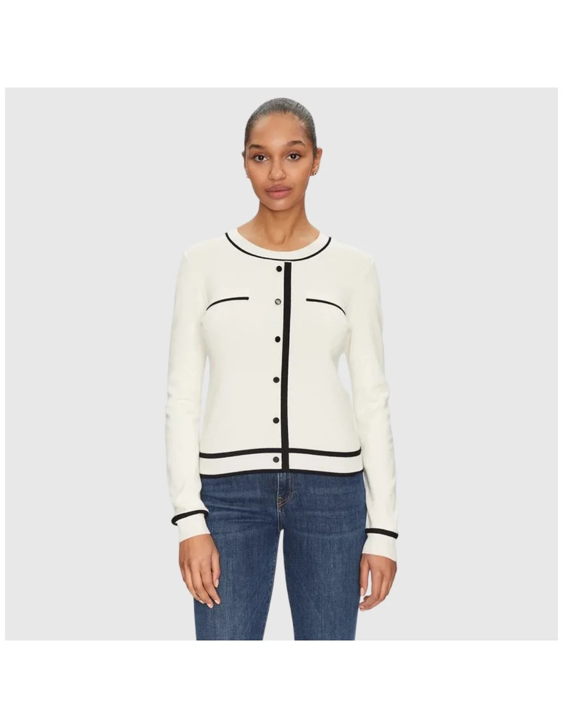 El jersey de Morgan presenta un diseño elegante con botonadura central y ribetes en contraste que delinean cuello, puños y cintura. Con corte entallado y cuello redondo, incorpora bolsillos decorativos en el pecho que aportan un aire refinado. Su tejido de punto fino lo convierte en una prenda ideal para estilismos formales o de oficina con un toque moderno.