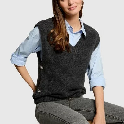 Chaleco de punto Morgan con escote en V y corte recto. Presenta un diseño de textura suave con botones decorativos metálicos en los costados que aportan un detalle distintivo. Una prenda versátil ideal para superponer sobre camisas o blusas y crear looks elegantes y modernos.
