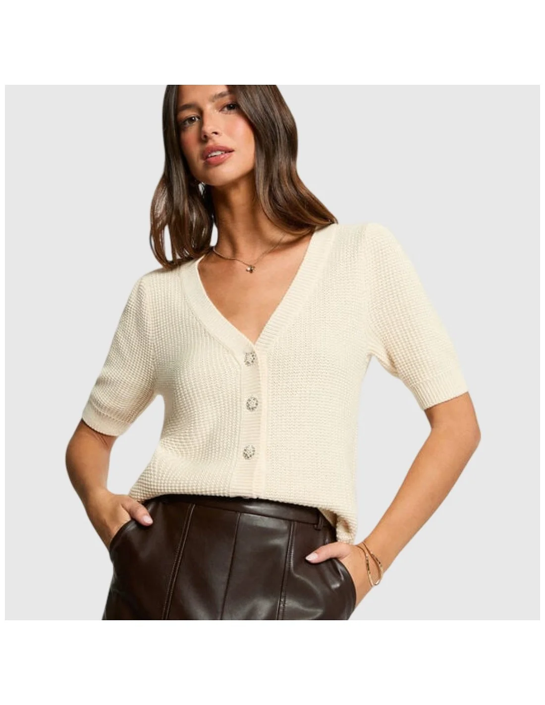 Cárdigan Morgan de manga corta con escote en pico y tejido de punto texturizado. Cierre frontal con botones joya que aportan un toque elegante y femenino. Diseño cómodo y versátil para looks casuales o sofisticados.