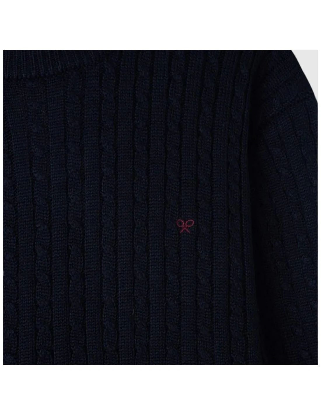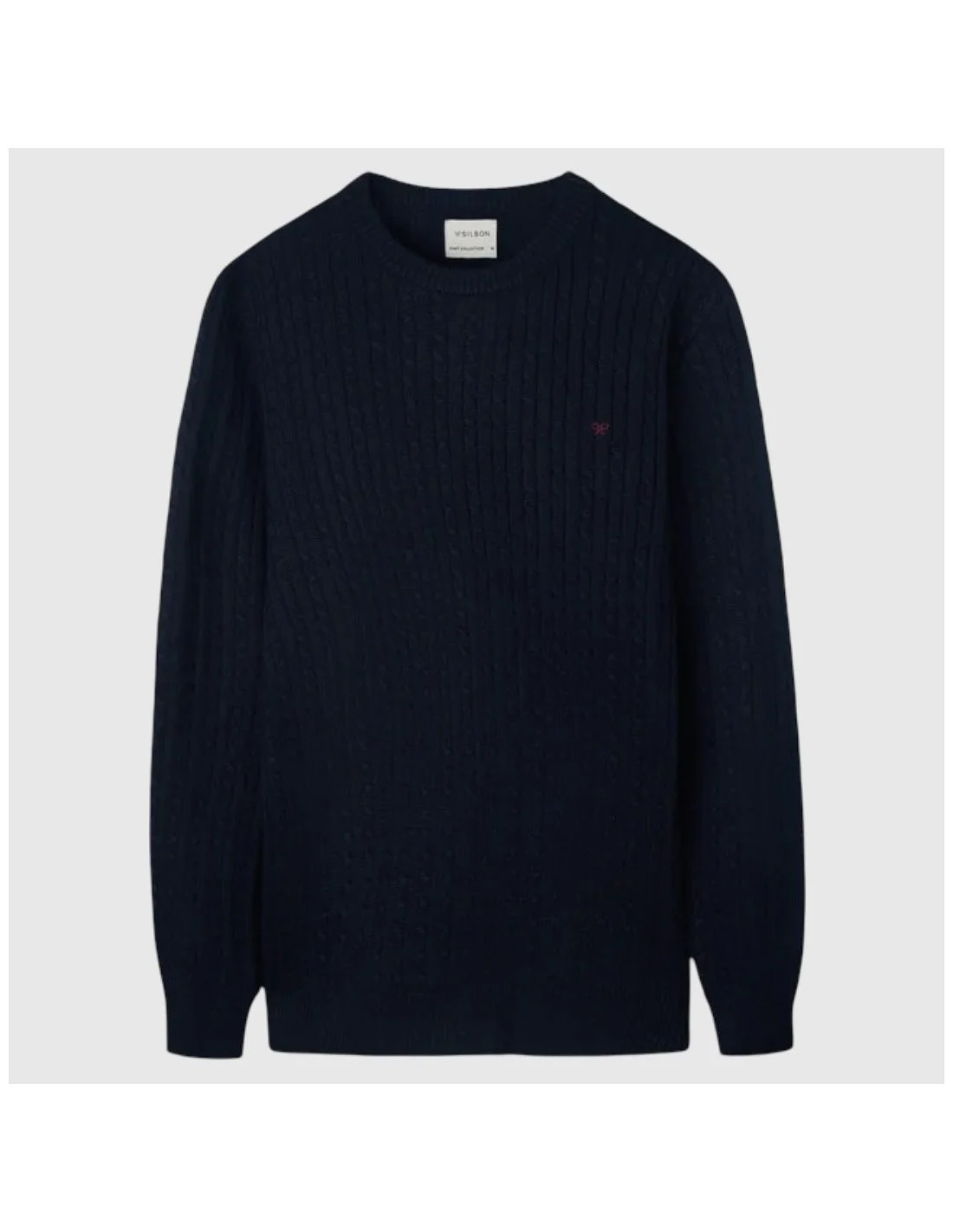 El jersey de punto trenzado de Silbon es una prenda clásica ideal para climas frescos. Confeccionado en un tono azul marino, presenta un diseño de canalé con textura y un discreto logo bordado en rojo en el pecho. Su ajuste regular y cuello redondo lo convierten en una opción elegante y versátil para un uso casual o semi-formal.