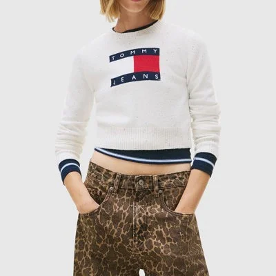 Jersey cropped de Tommy Hilfiger con cuello redondo y manga larga. Confeccionado en punto suave, destaca por el logo icónico bordado en el pecho. Presenta acabados acanalados en cuello, puños y dobladillo, aportando un ajuste cómodo y un estilo juvenil y urbano.