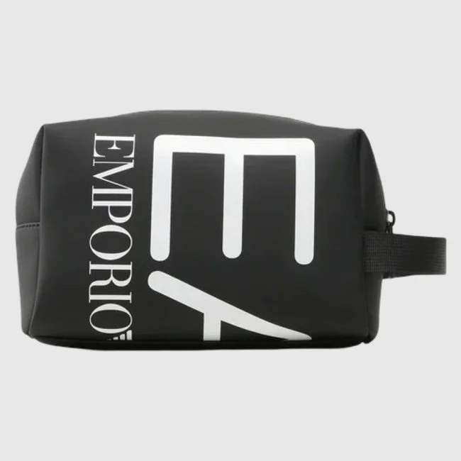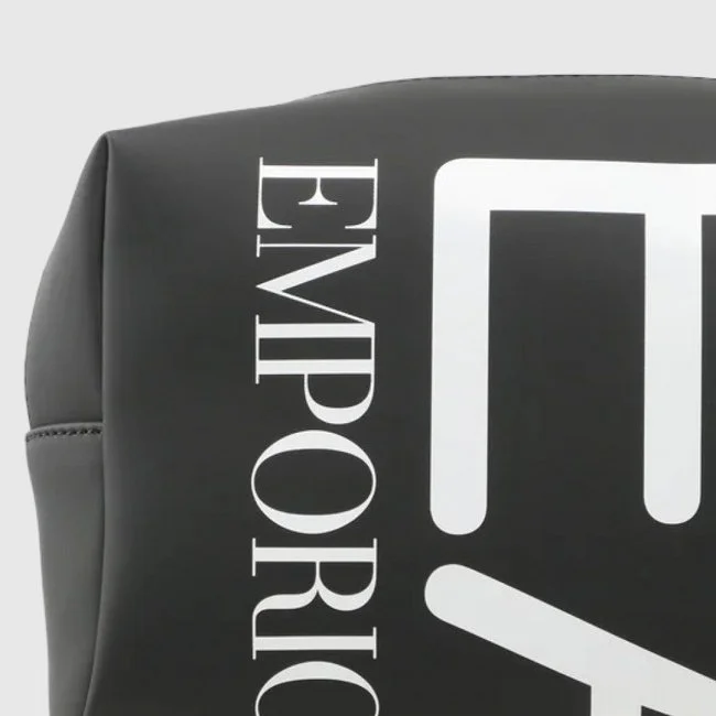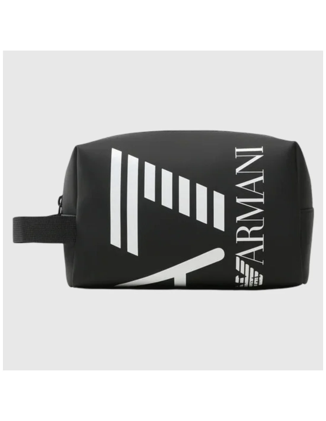 Neceser de la marca Emporio Armani con diseño moderno y funcional. Presenta forma rectangular con cremallera superior y asa lateral para facilitar su transporte. Decorado con el logotipo EA7 en gran tamaño a ambos lados. Ideal para llevar artículos de aseo personal o pequeños objetos durante viajes o en el día a día.