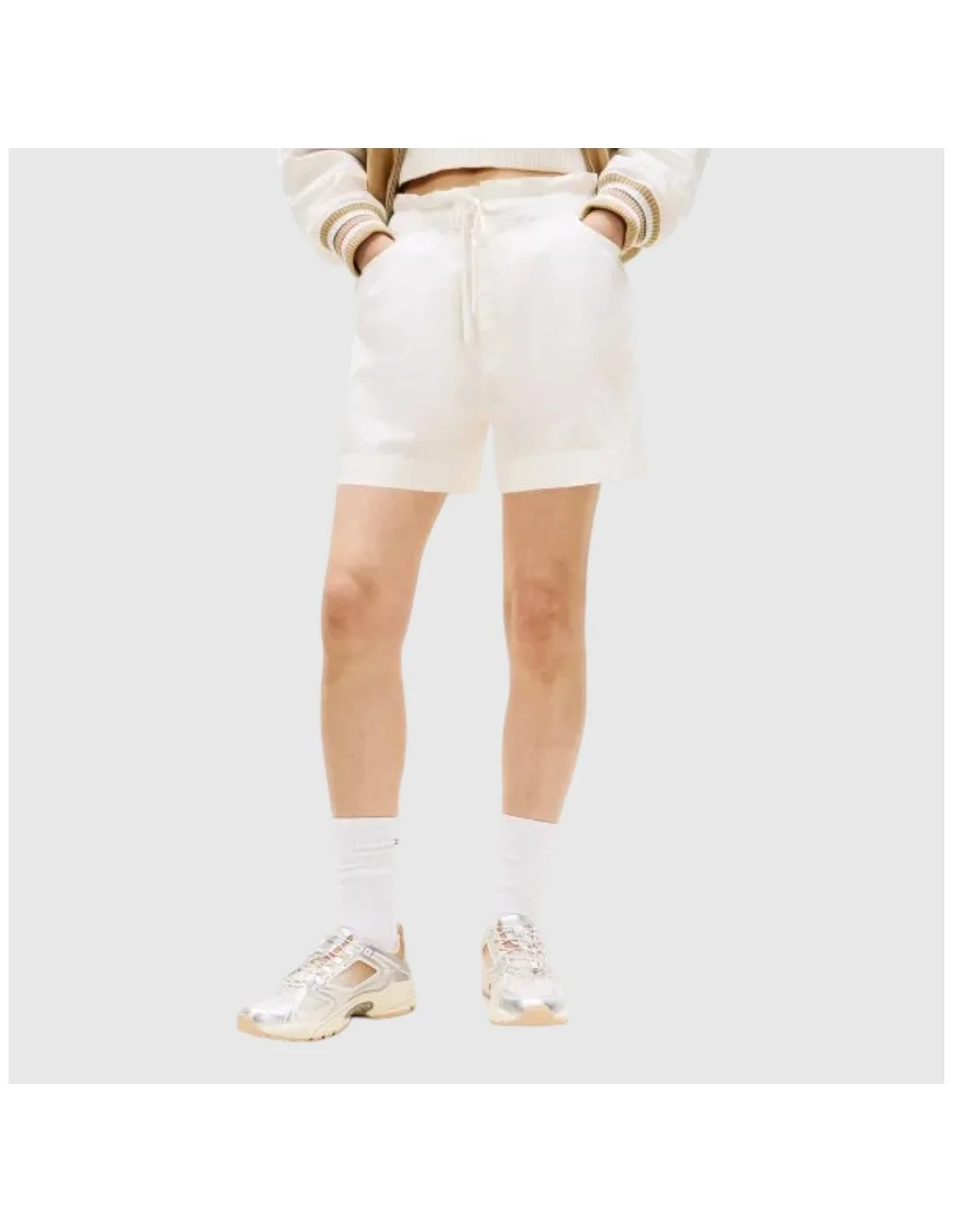 Short Tommy Hilfiger para mujer de estilo casual diseñado para ofrecer comodidad y libertad de movimiento. Presenta cintura elástica con cordón ajustable que permite un ajuste personalizado. Incorpora bolsillos laterales funcionales y un bolsillo trasero con la bandera icónica de la marca como detalle distintivo. Su diseño ligero y su silueta relajada lo convierten en una prenda versátil para looks informales y de verano.