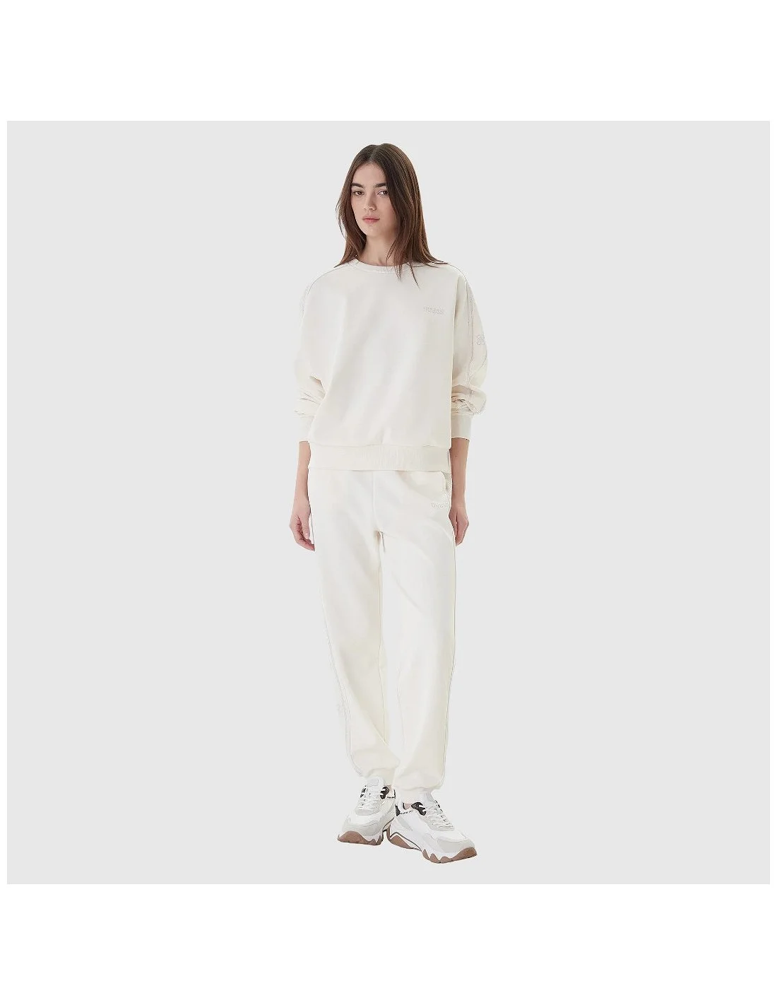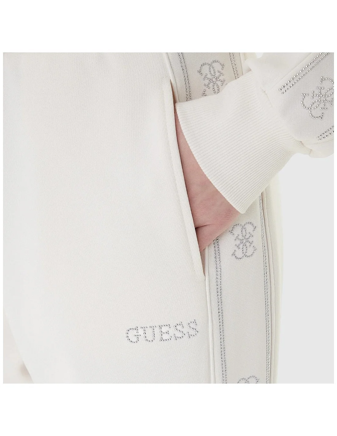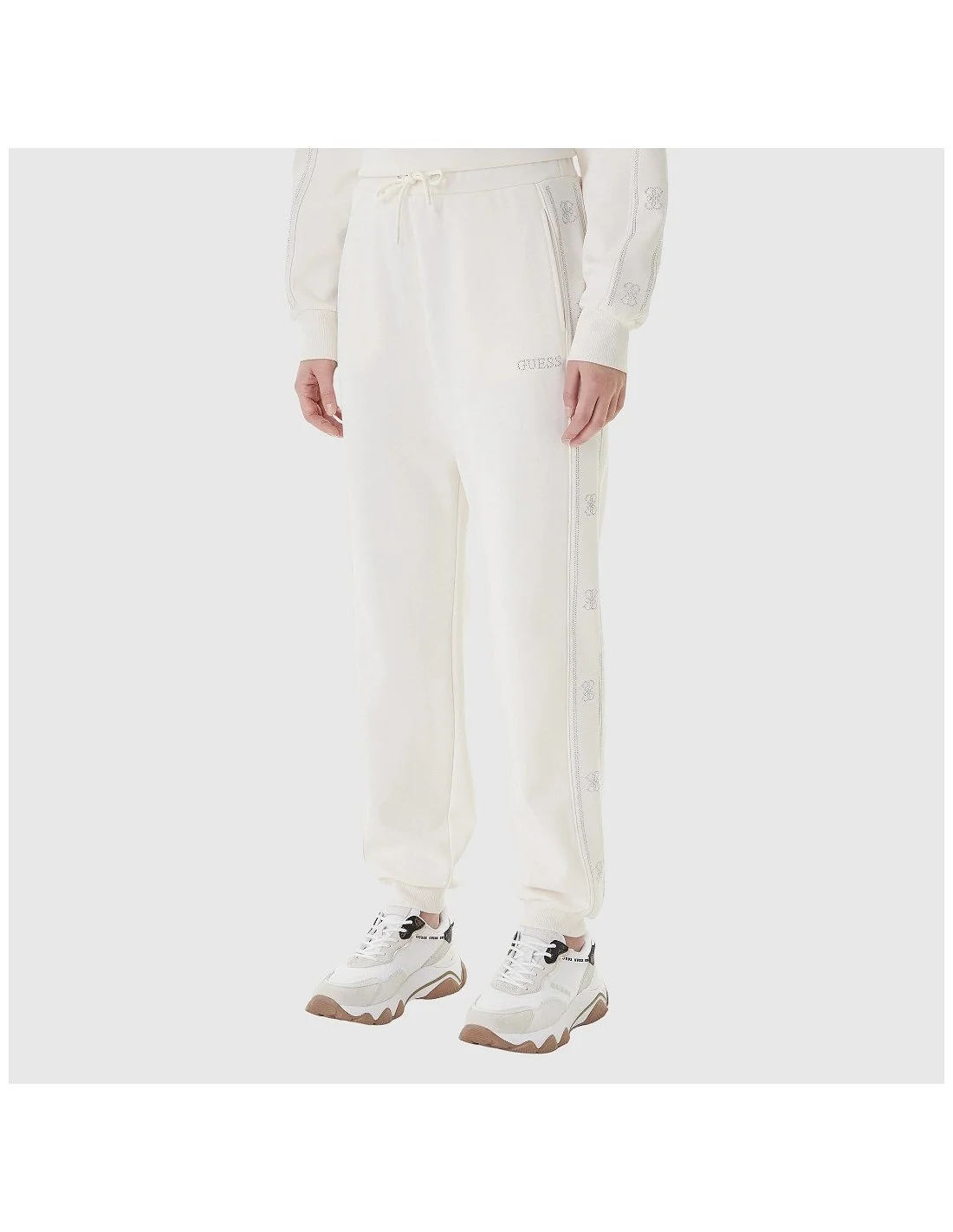 El pantalón Guess para mujer combina comodidad y estilo en una prenda de corte relajado y ajuste amplio. Presenta cintura elástica con cordón, bolsillos laterales y detalles laterales con logotipo y motivos de la marca en strass que aportan un toque sofisticado. Ideal para outfits casuales, urbanos o athleisure, ofreciendo funcionalidad sin sacrificar tendencia.