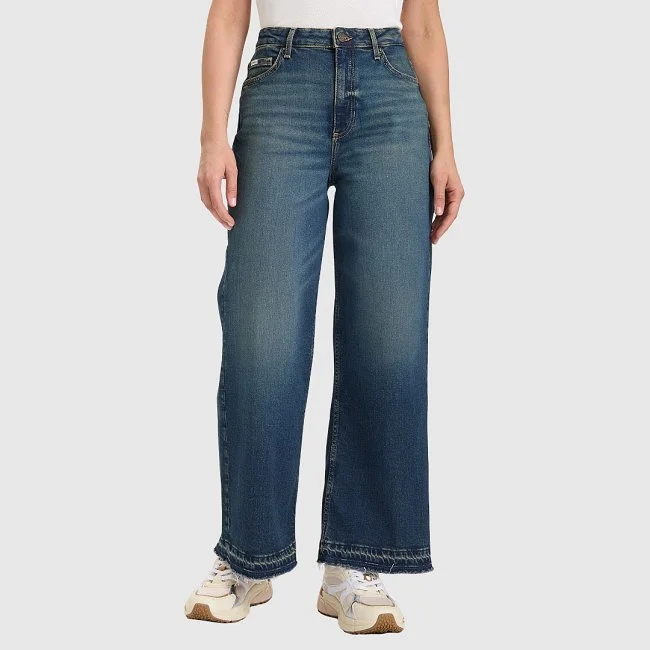 Pantalón vaquero de la marca Guess con corte wide leg y tiro alto. Presenta un diseño de cinco bolsillos, detalles de costuras contrastantes y efecto desgastado en el denim. El bajo acabado sin rematar aporta un estilo moderno y desenfadado, ideal para looks casuales.