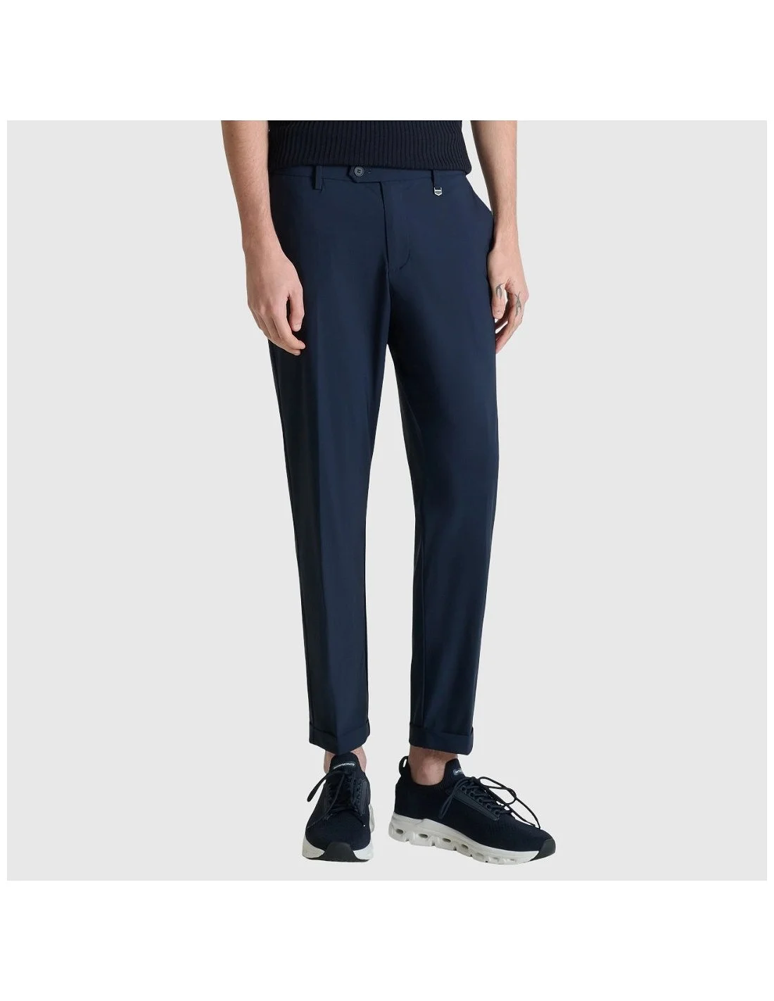 Pantalón de Antony Morato con diseño moderno de corte slim y acabado ligeramente elástico para mayor comodidad. Cuenta con cintura elástica posterior, cierre con cremallera y botón, bolsillos laterales inclinados y bolsillos traseros tipo ojal. Ideal para looks casuales o semi-formales con un toque pulido y versátil.