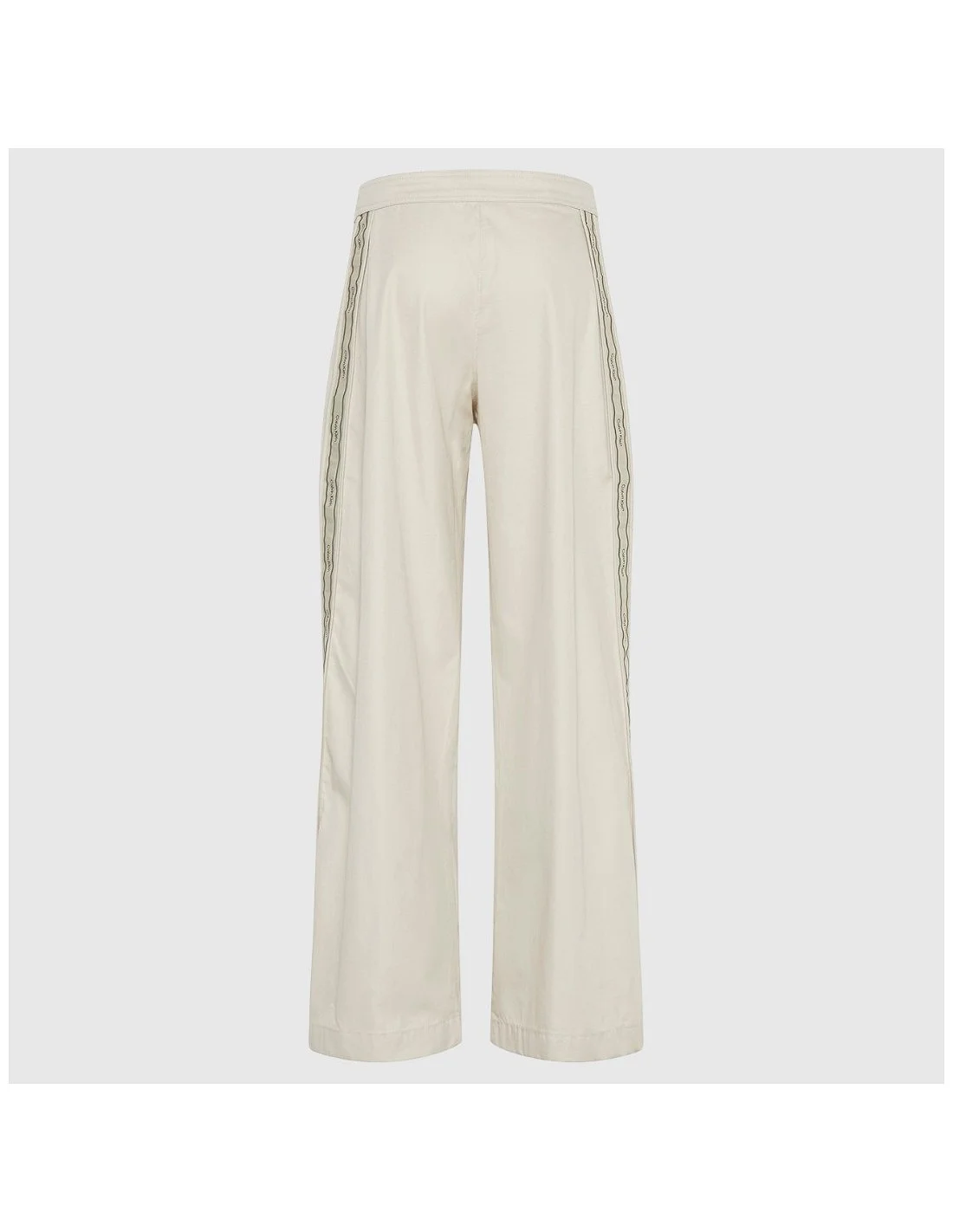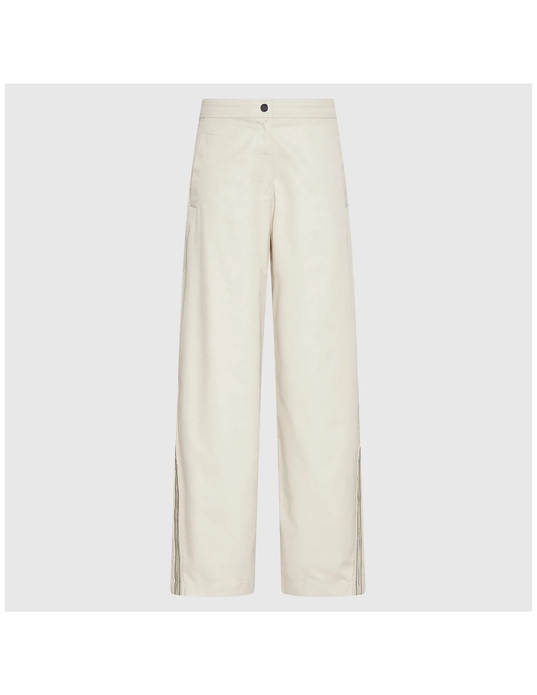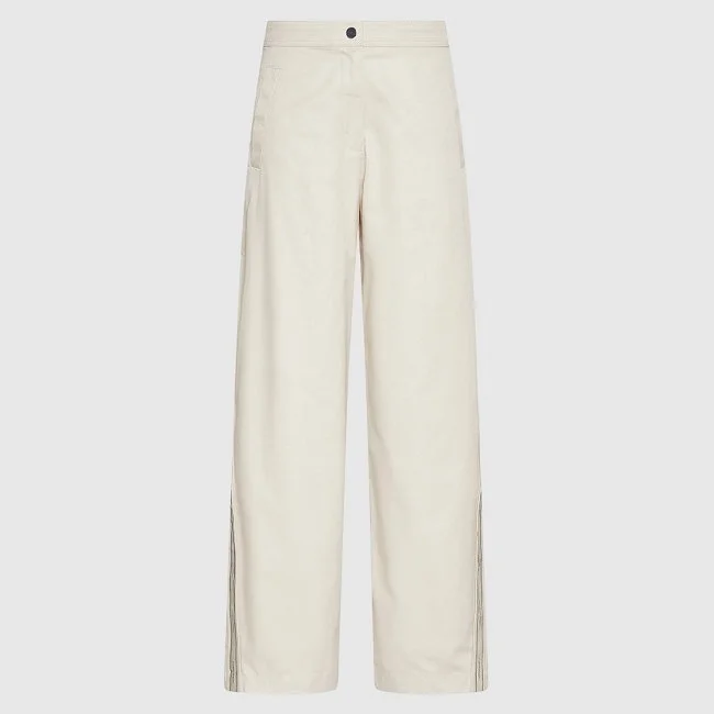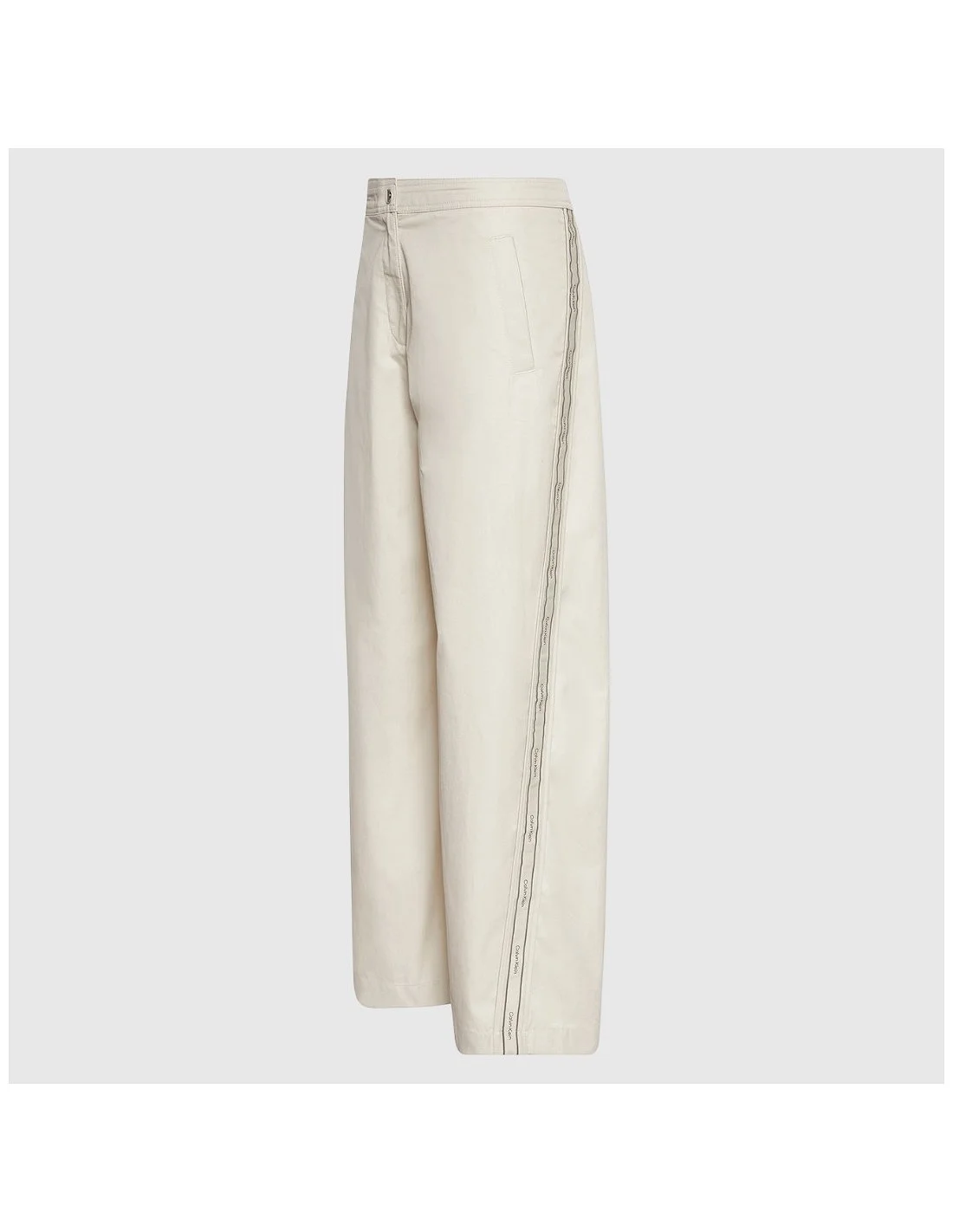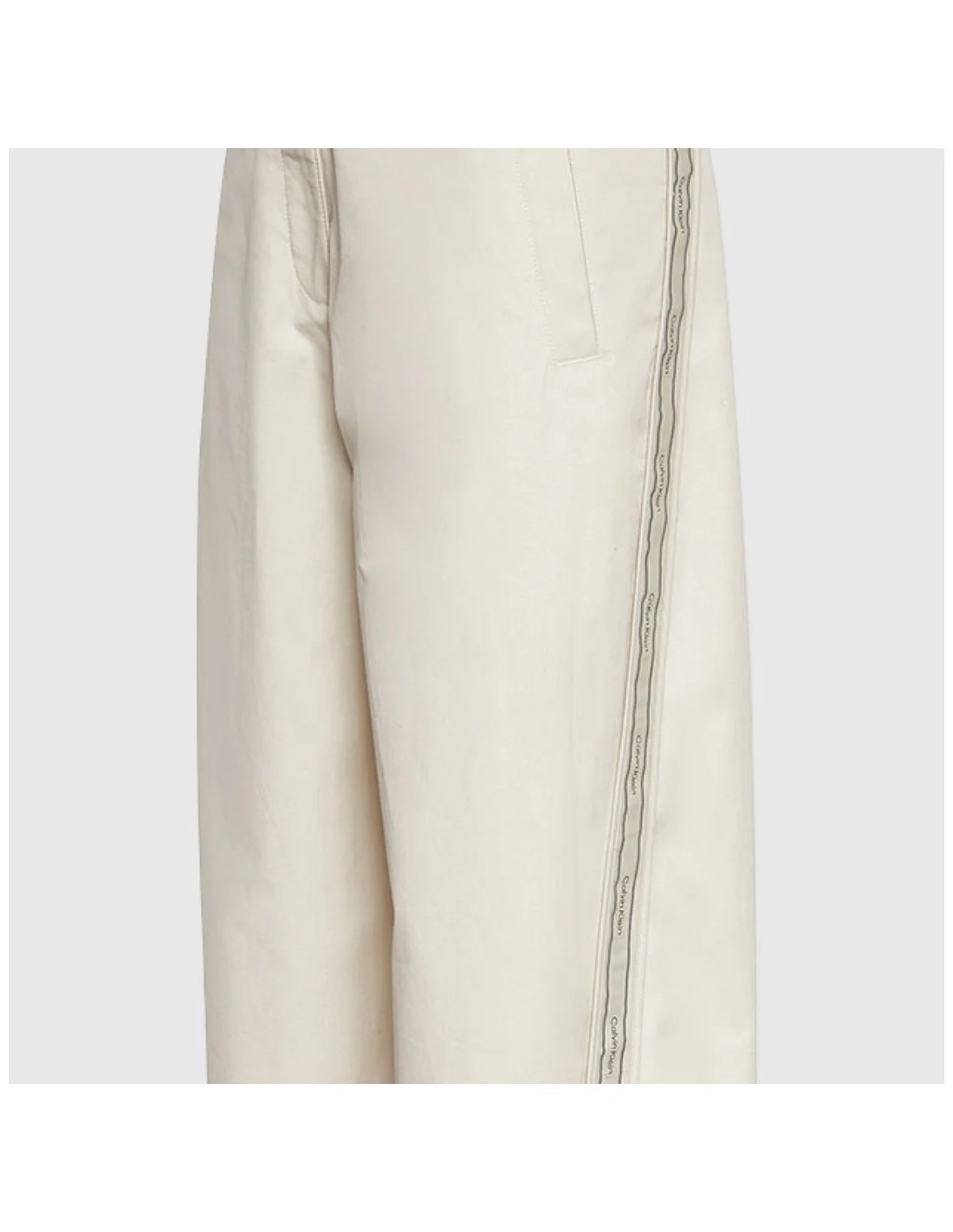 El pantalón de Calvin Klein presenta un corte recto y amplio con cintura de talle medio y cierre con botón. Confeccionado en tejido de algodón, incorpora bolsillos laterales y cintas decorativas con el logotipo de la marca a lo largo de las piernas. Su estilo relajado lo convierte en una opción cómoda y versátil para looks casuales y contemporáneos.