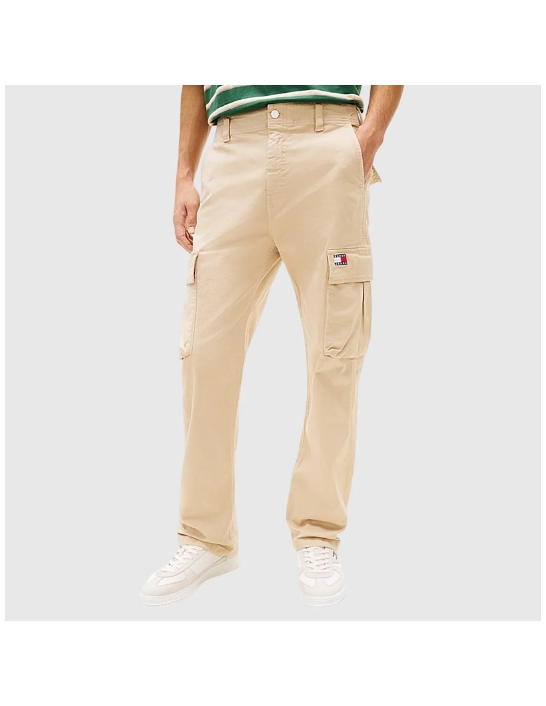 Pantalones tipo cargo para hombre de la marca Tommy Hilfiger. Están confeccionados en algodón de color beige claro, con múltiples bolsillos laterales, traseros y delanteros. Incluyen el logo clásico de Tommy Hilfiger en uno de los bolsillos de la pierna. De corte recto, son ideales para un look casual y funcional.