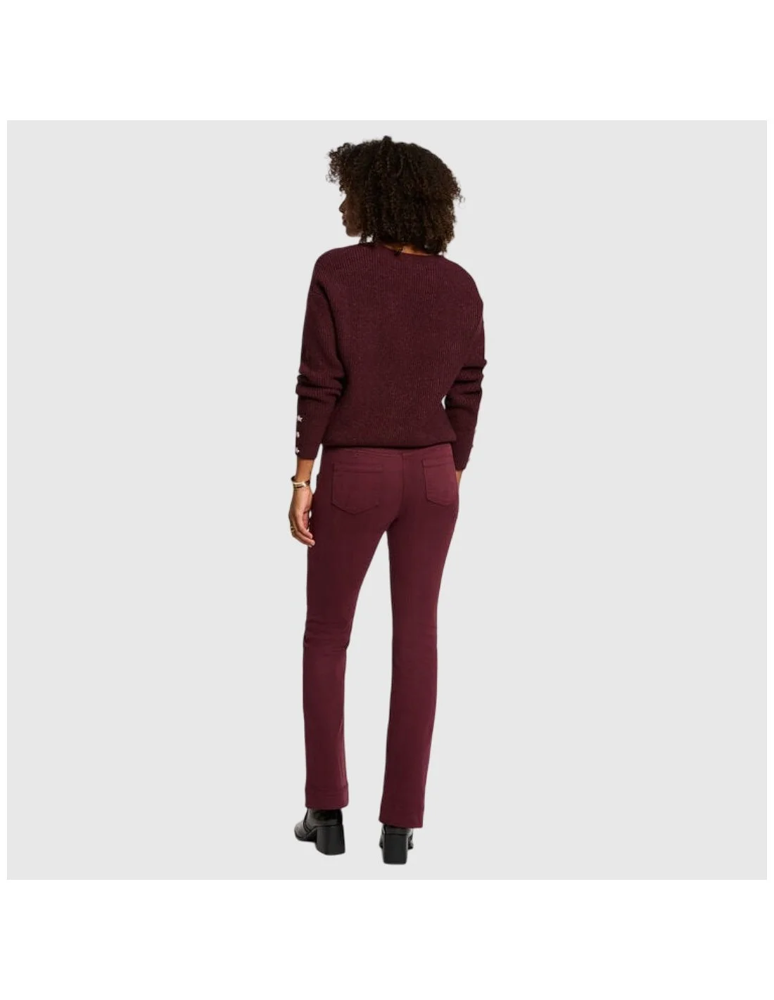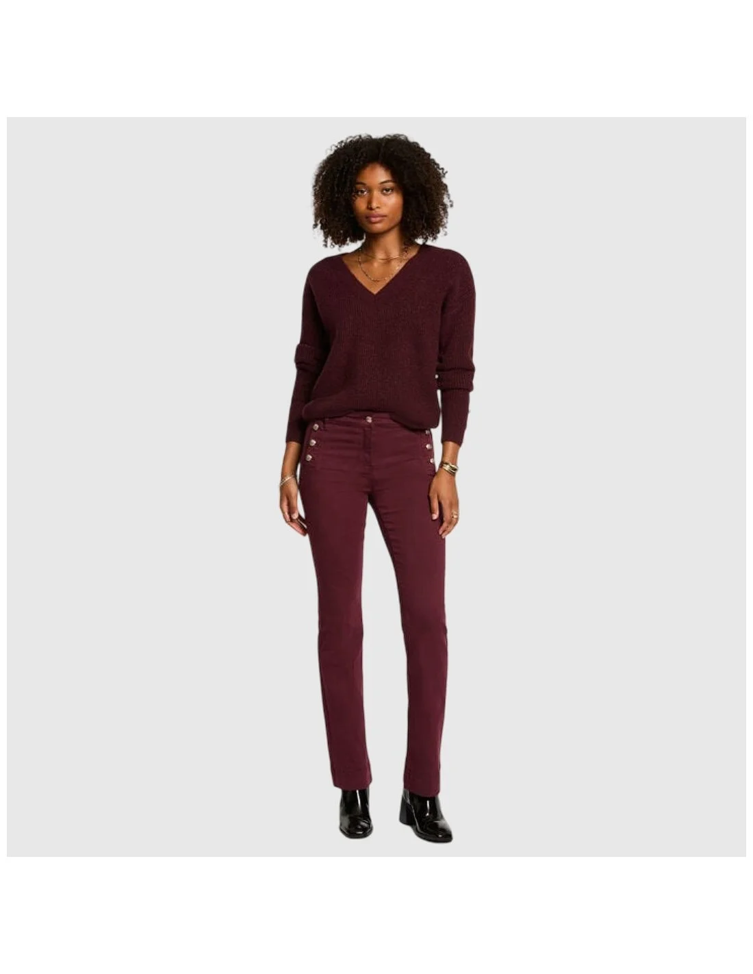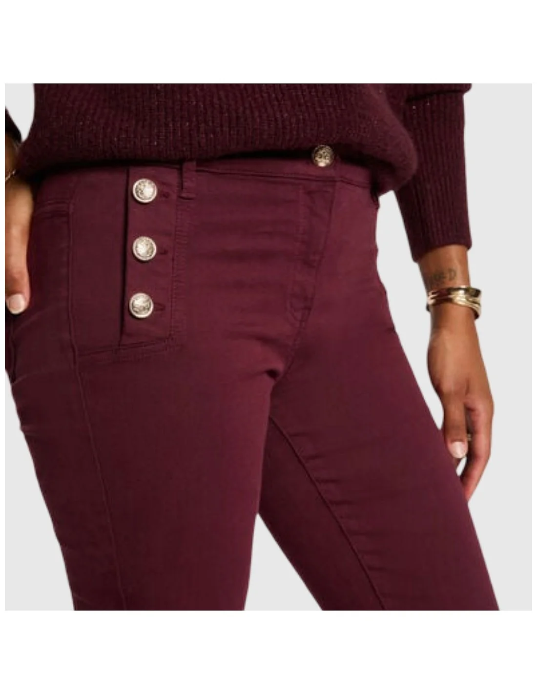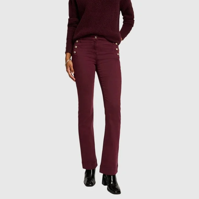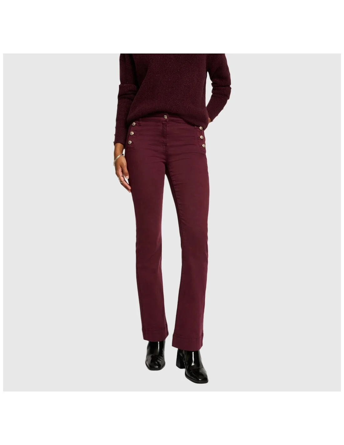 Pantalón Morgan con corte recto y diseño de inspiración marinera. Presenta detalle de botones metálicos decorativos en la cintura, bolsillos traseros de parche y acabado entallado que estiliza la figura. Una prenda versátil y elegante para combinar tanto en looks casuales como más sofisticados.