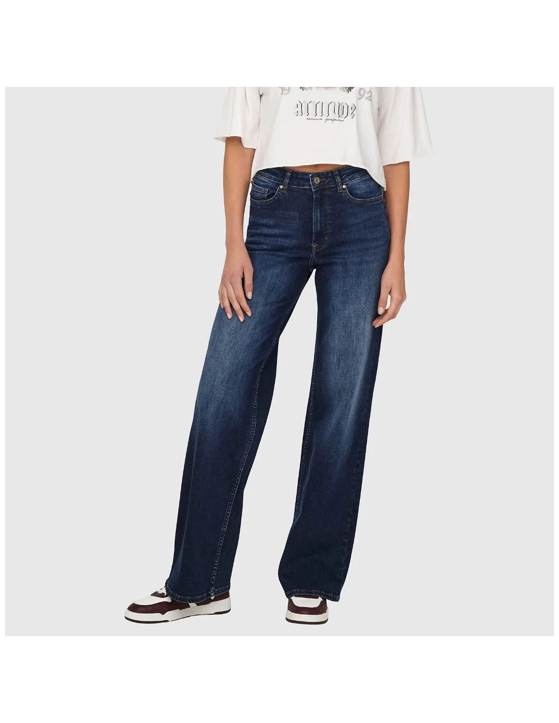 El pantalón vaquero de ONLY es una propuesta de estilo relajado con corte wide leg, ideal para looks urbanos con personalidad. Fabricado en denim elástico, presenta un tiro alto y lavado oscuro con efecto desgastado que realza la silueta. Incluye bolsillos clásicos y cierre de botón y cremallera. Perfecto para combinar con camisetas o blusas en outfits desenfadados.