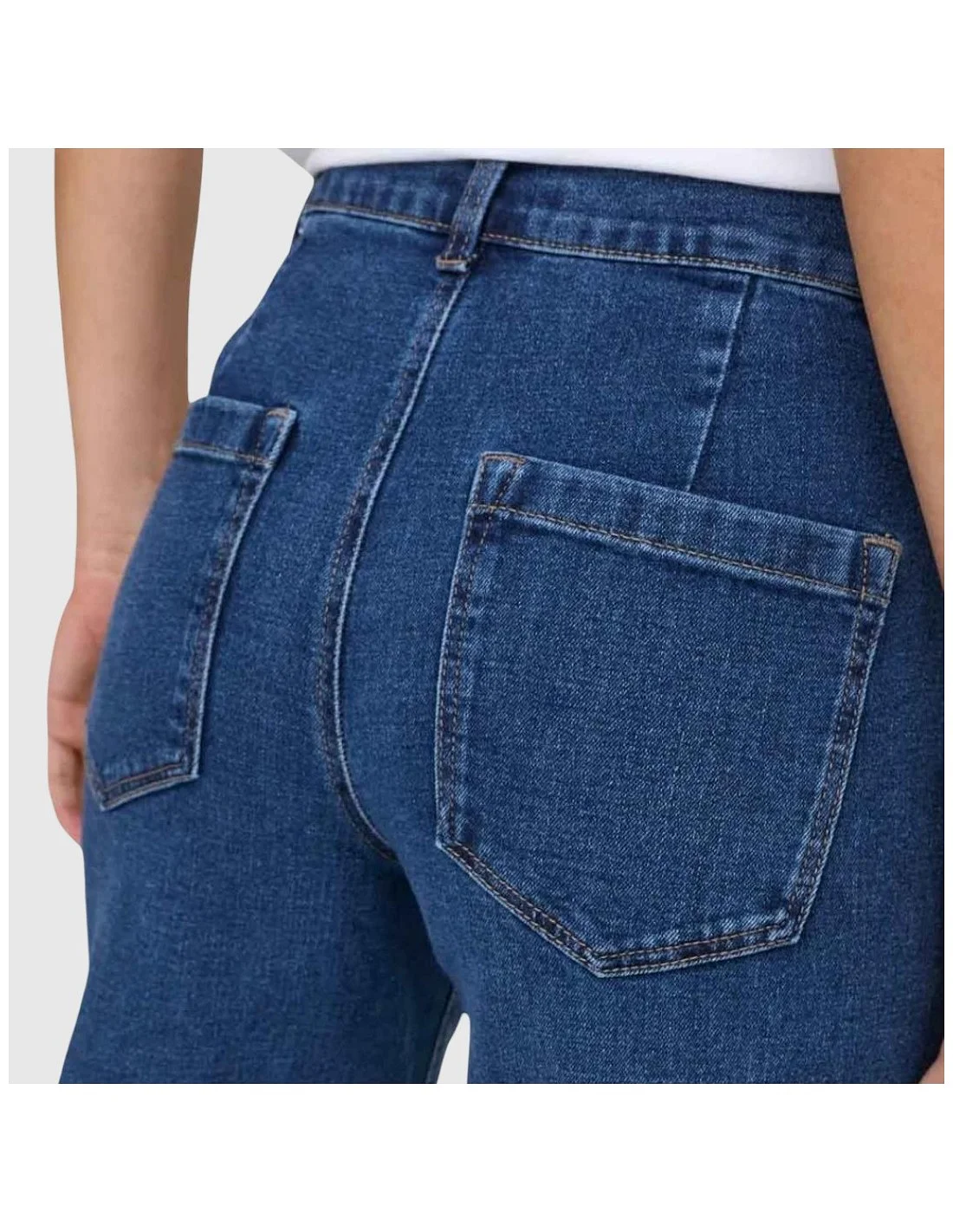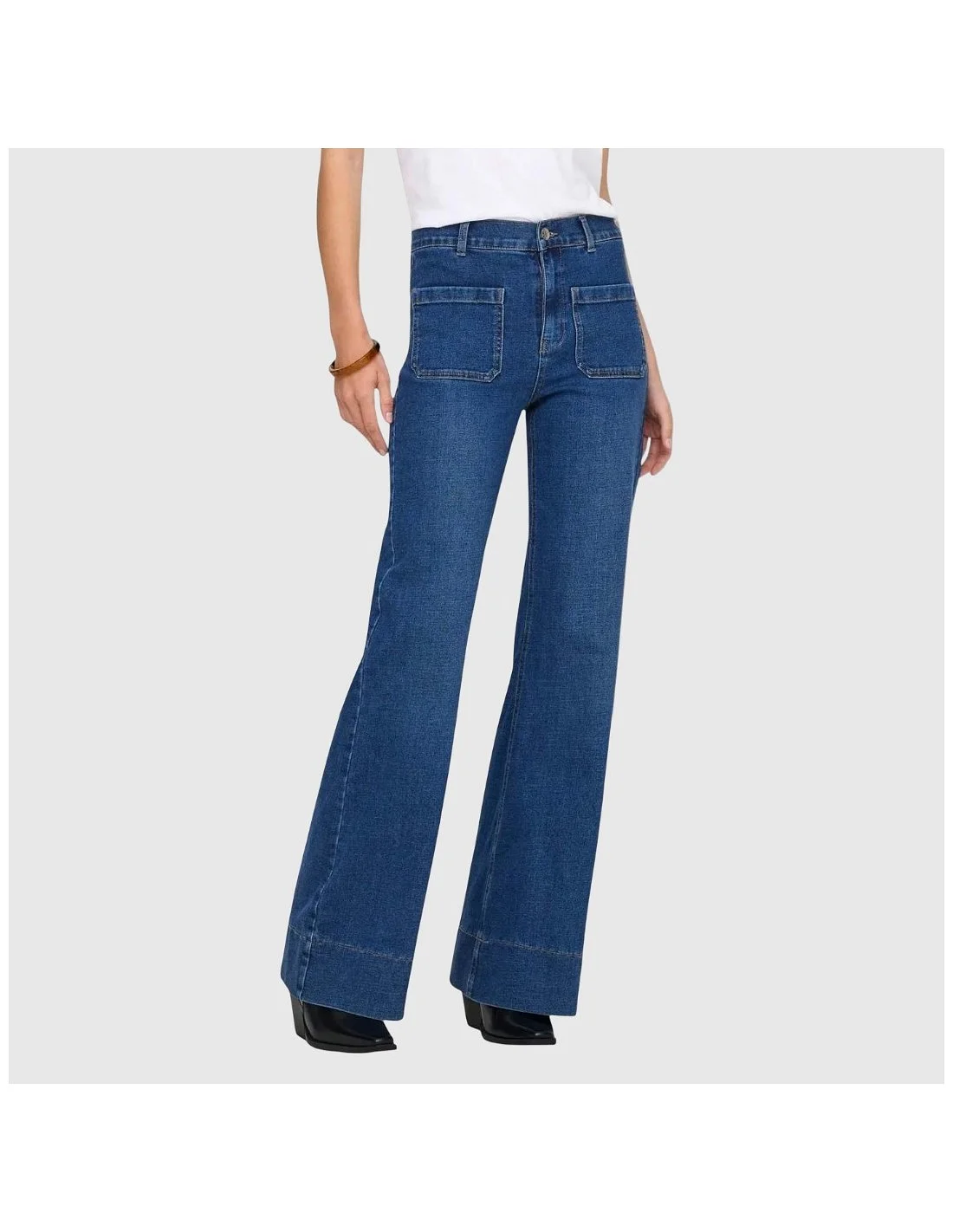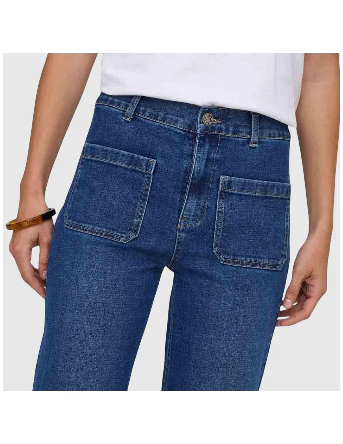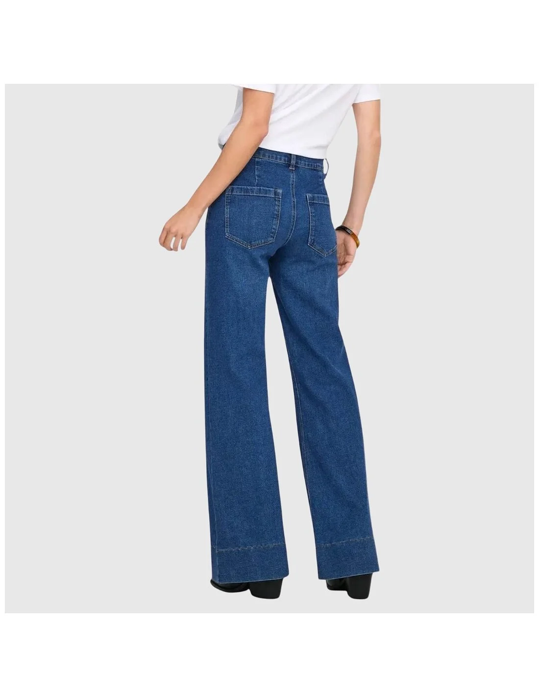 Jeans ONLY de corte flare en denim azul medio, con tiro alto y bolsillos grandes tipo parche en frontal y trasero. Diseño setentero con costuras marcadas y acabado ligeramente elástico que aporta comodidad. Perfectos para alargar visualmente la silueta y combinar con botas o tacones.