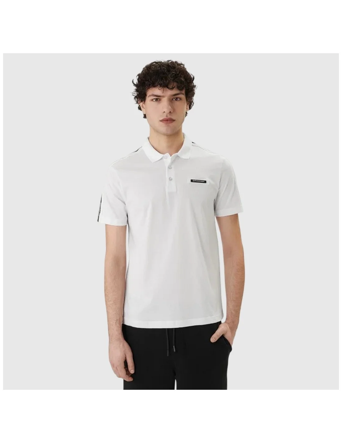 Polo EA7 Emporio Armani con cierre de botones y detalle de cintas con logo en los hombros. Incluye un parche distintivo en el pecho que refuerza su estilo deportivo y sofisticado. Ideal para un look casual con un toque premium.