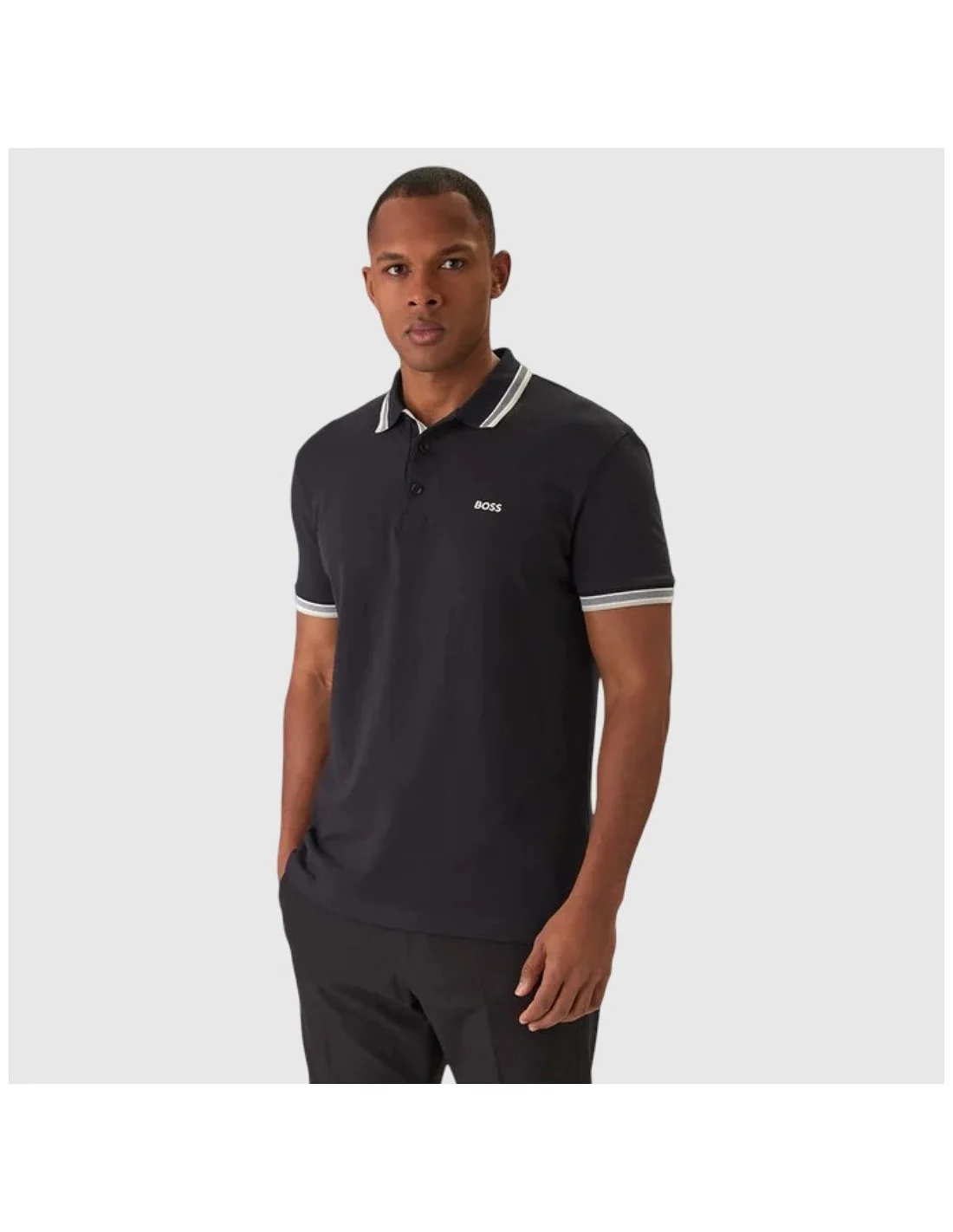 Polo de hombre BOSS de corte clásico con cuello y puños acanalados decorados con franjas en contraste. Presenta cierre de tres botones en la parte frontal y el logotipo de la marca bordado en el pecho. Una prenda versátil y elegante, ideal para un estilo casual refinado.