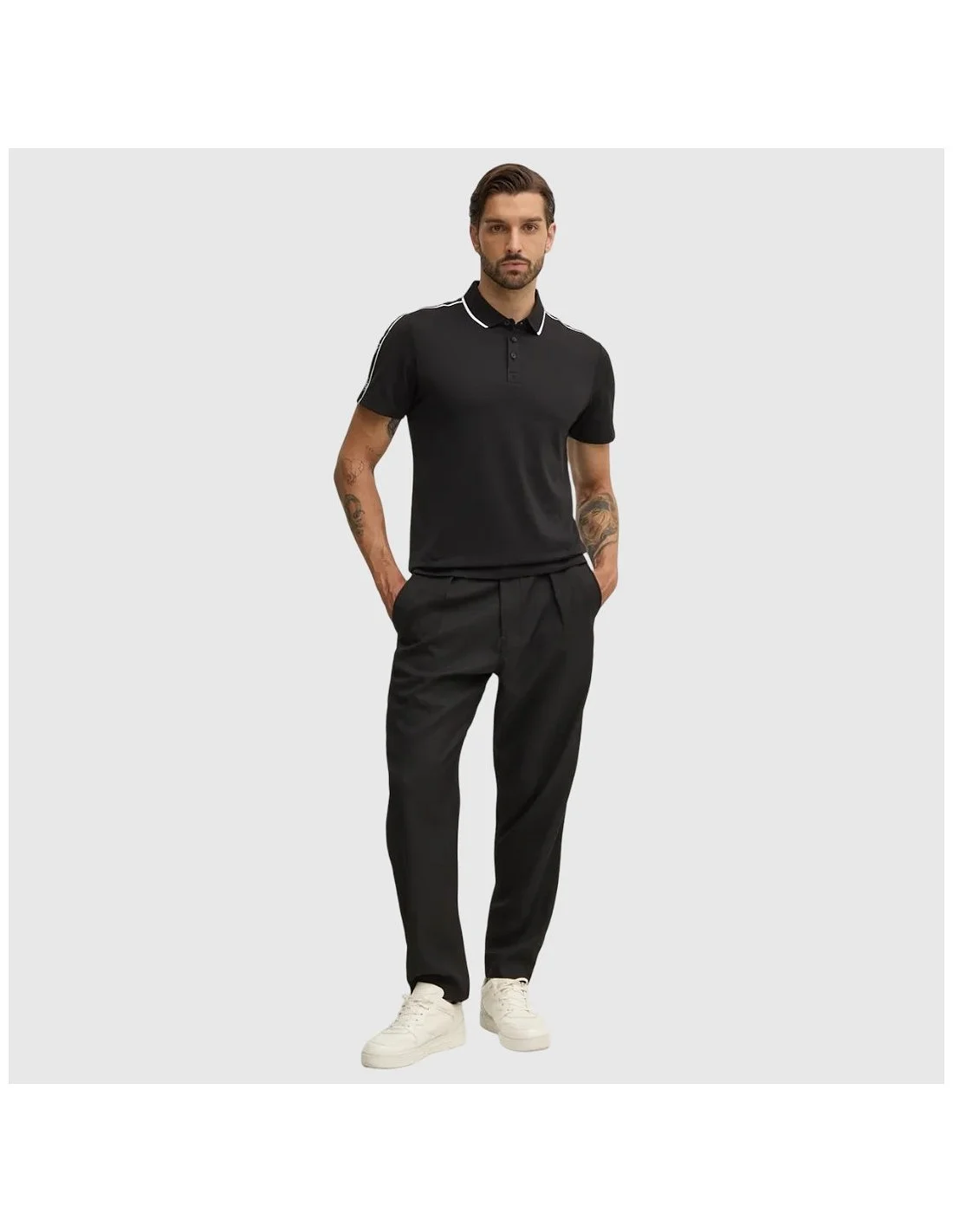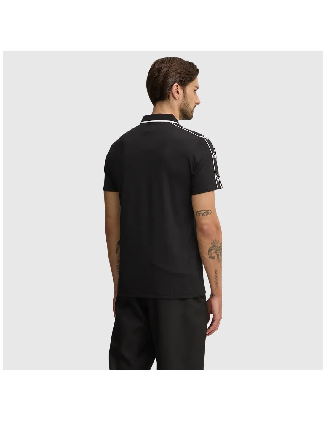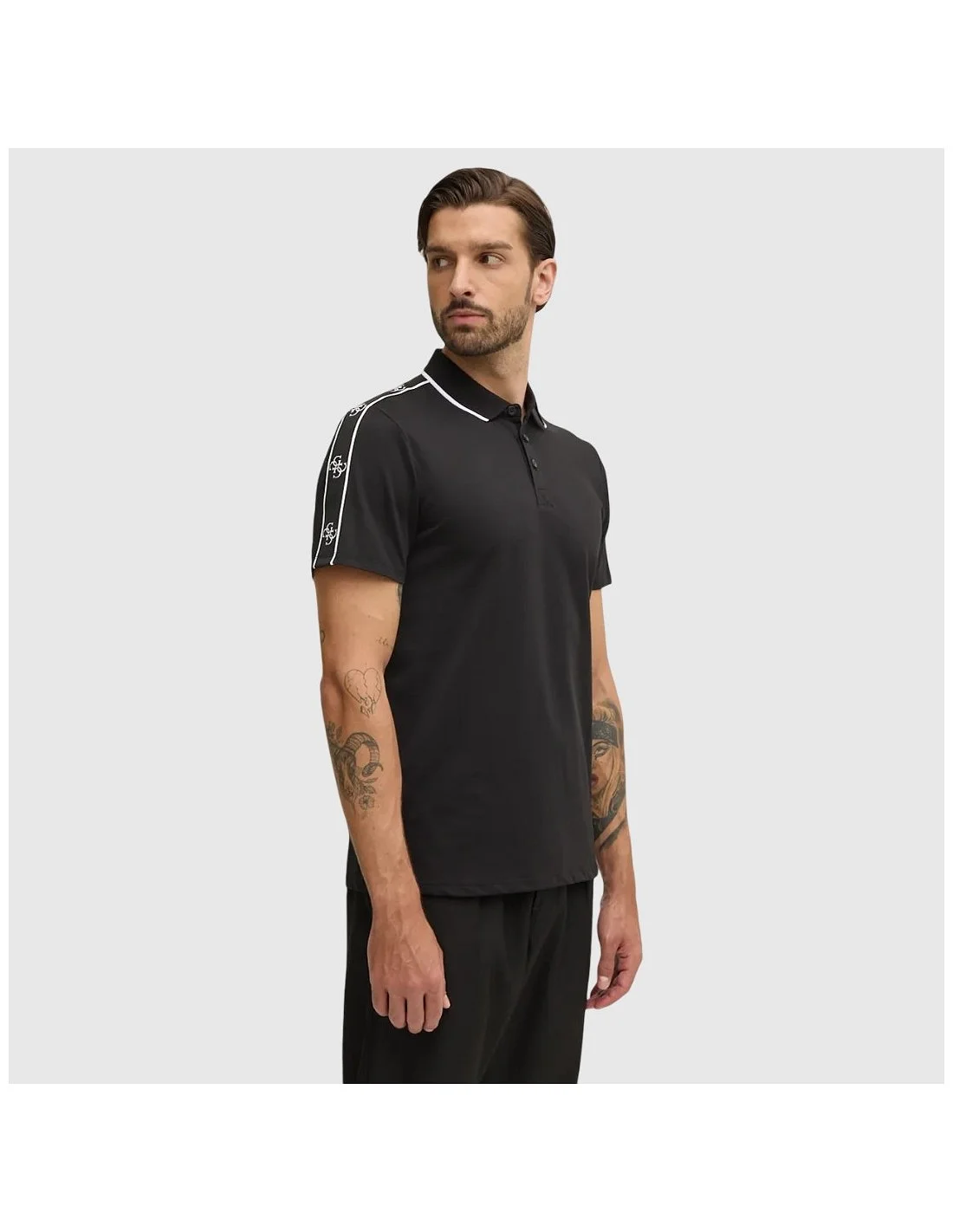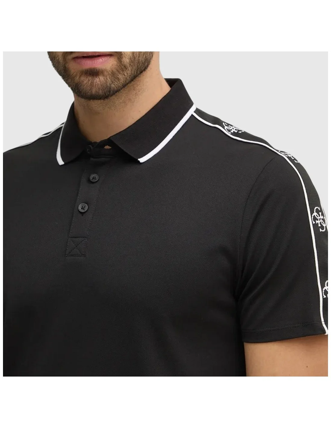 El polo de hombre Guess presenta un diseño de manga corta con cuello clásico y cierre de botones. Los ribetes a contraste en el cuello y los hombros, junto con el detalle de logotipo en las mangas, aportan un estilo moderno y distintivo. Confeccionado en tejido de punto, es ideal para looks casuales con un toque sofisticado.