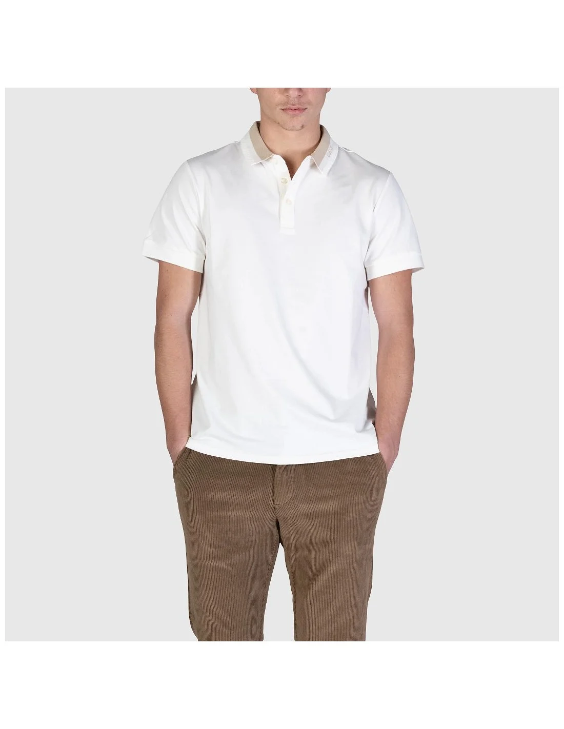 Polo de hombre Guess de diseño clásico con cuello de punto canalé en contraste, decorado con el nombre de la marca en un lateral. Presenta cierre de tres botones y mangas cortas con terminaciones acanaladas. Una prenda versátil, ideal para looks casuales con un toque sofisticado.