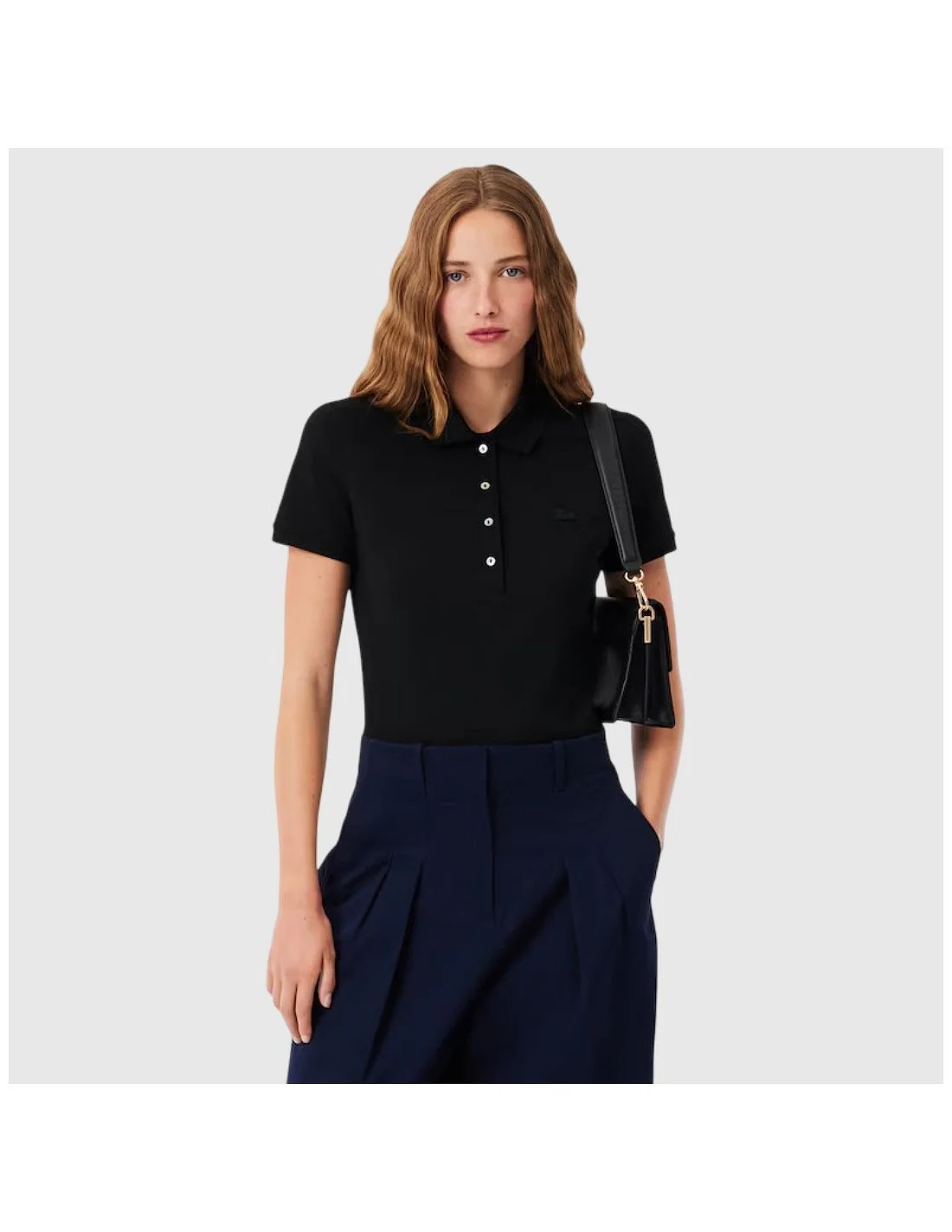 Este polo para mujer de Lacoste presenta un diseño clásico de corte ajustado que combina elegancia deportiva con estilo atemporal. Está confeccionado en un tejido suave de punto piqué elástico, que proporciona comodidad y libertad de movimiento. Incluye un cuello tipo polo con tapeta de botones, mangas cortas con terminaciones acanaladas y el icónico logotipo del cocodrilo bordado en el pecho a tono. Ideal para un look casual refinado.