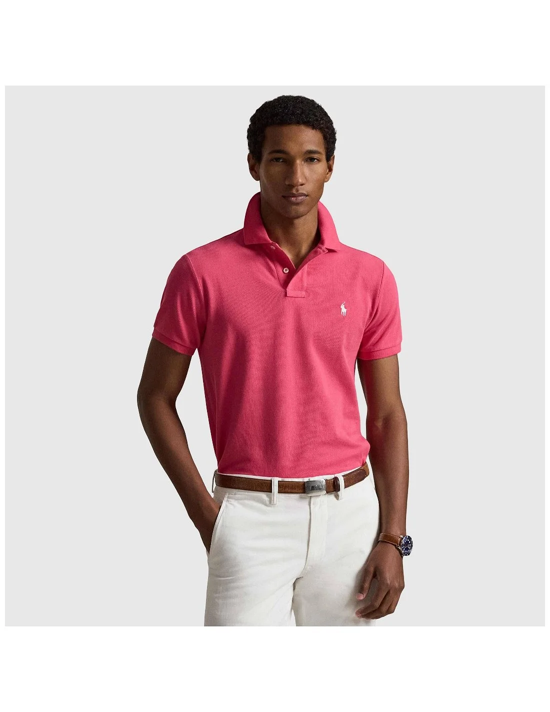 El polo Ralph Lauren de manga corta destaca por su diseño clásico y elegante. Confeccionada en algodón piqué, ofrece un ajuste entallado que realza la silueta. Incorpora cuello tipo camisero, tapeta con dos botones y el icónico logotipo bordado en el pecho. Ideal para un estilo casual refinado, perfecta para el día a día o encuentros informales.