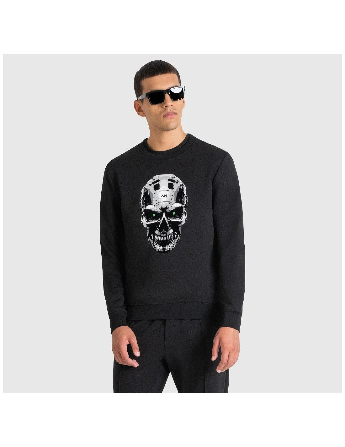 Sudadera Antony Morato de cuello redondo con diseño de calavera futurista en la parte frontal. Presenta corte regular, puños y bajo acanalados para un mejor ajuste. Confeccionada en tejido suave y cómodo, ideal para aportar un toque moderno y atrevido a los looks casuales.