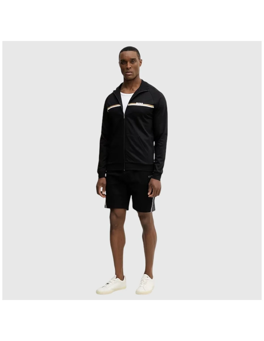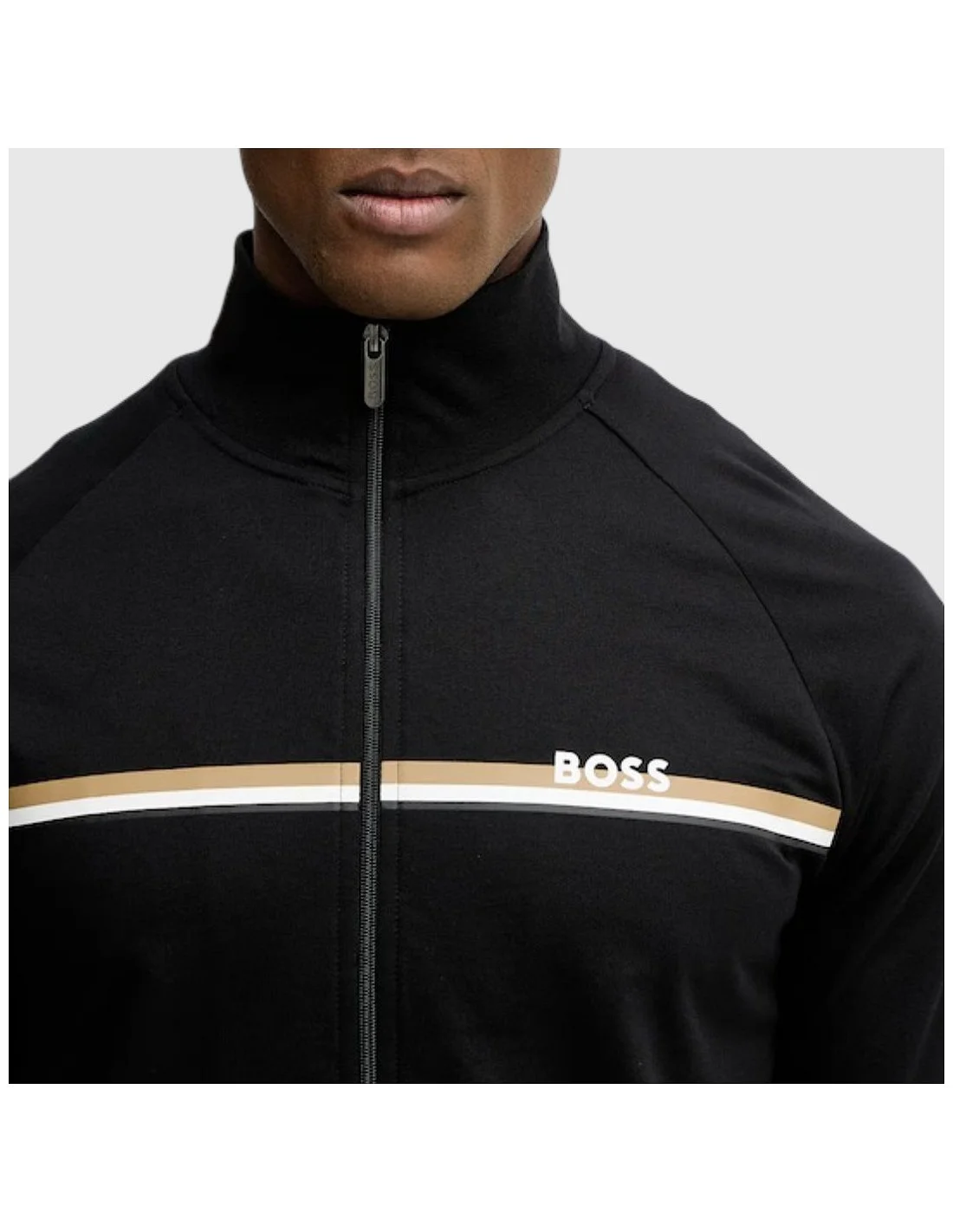 Sudadera BOSS con cremallera completa y diseño moderno. Presenta un corte regular con cuello alzado, bolsillos laterales y detalles de líneas horizontales en contraste en el pecho. El logotipo de la marca se encuentra impreso en el lado izquierdo. Ideal para looks casuales o actividades deportivas, combinando comodidad y estilo urbano.