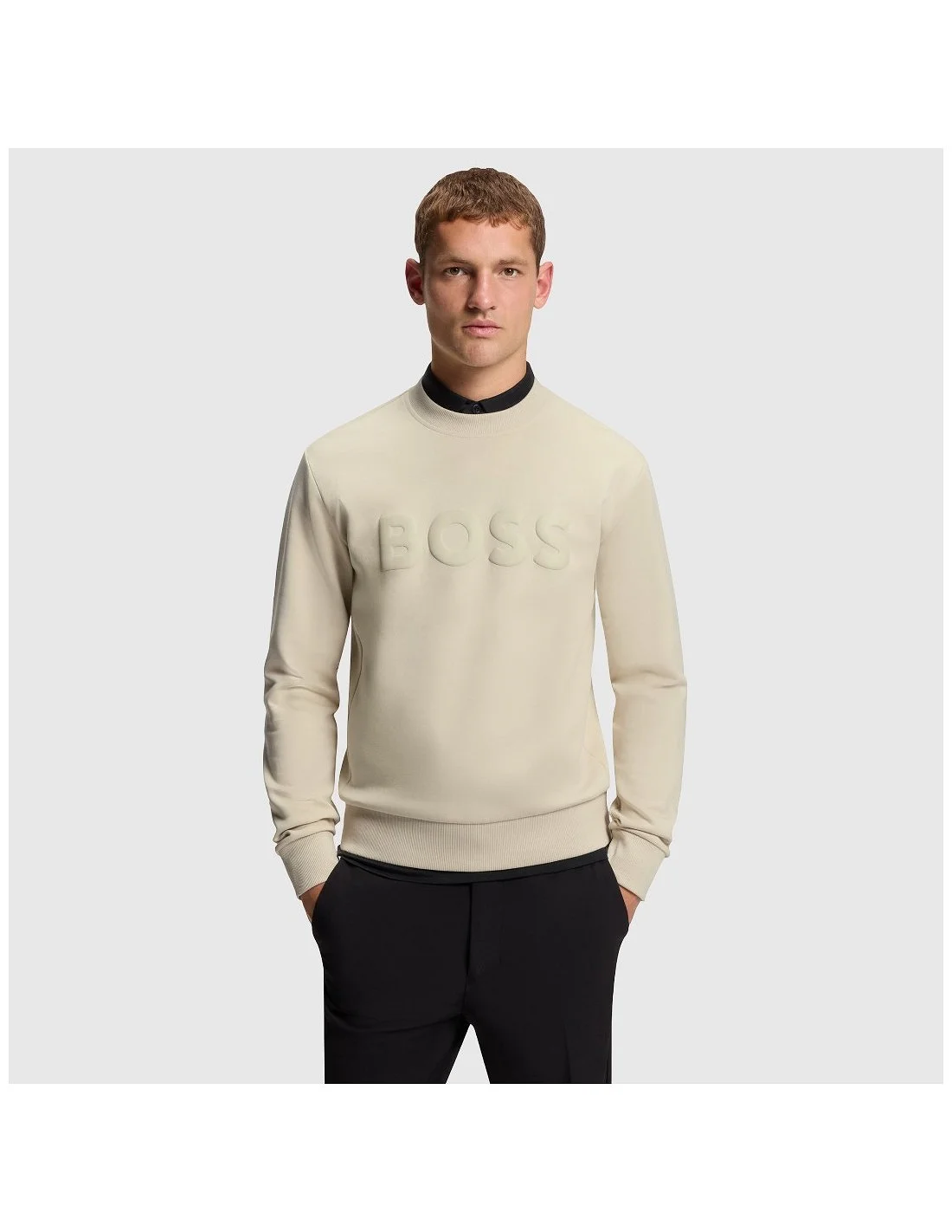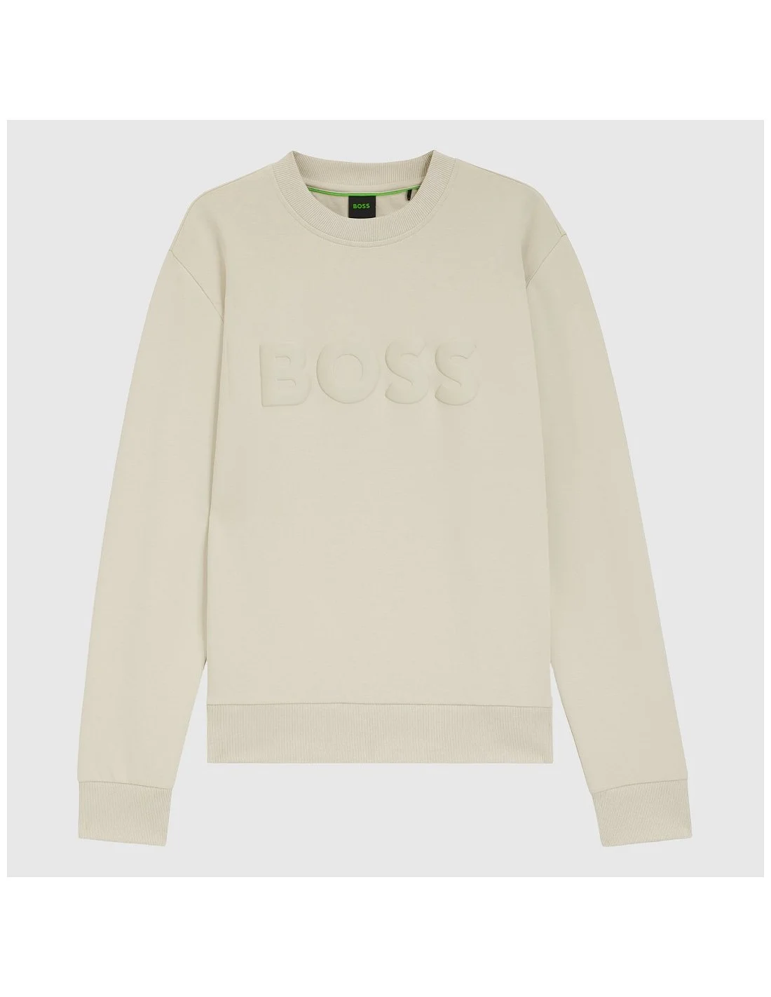 Sudadera de BOSS con diseño moderno y minimalista. Presenta un ajuste regular con cuello redondo, puños y cintura acanalados. Destaca el logotipo de la marca en relieve en la parte frontal del pecho, aportando un toque distintivo al diseño. Ideal para un estilo casual con un enfoque elegante y urbano.