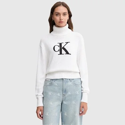 El jersey Calvin Klein presenta un diseño moderno con cuello alto de canalé y manga larga. Confeccionado en punto de algodón suave, ofrece comodidad y un ajuste favorecedor. Destaca el logotipo de la marca en la parte frontal, que aporta un estilo distintivo y sofisticado. Ideal para looks casuales y urbanos en días frescos.