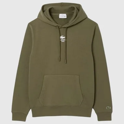 La sudadera con capucha Lacoste es una prenda casual confeccionada en algodón suave, perfecta para climas frescos. Presenta un diseño en verde oliva con logotipo frontal minimalista y estampado gráfico en la espalda. Su ajuste regular, bolsillo canguro y capucha con cordón ofrecen comodidad y estilo para el uso diario. Ideal para un look urbano relajado.
