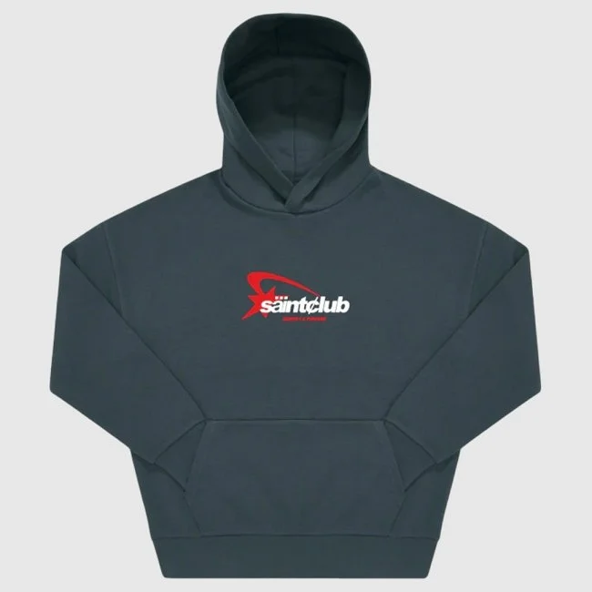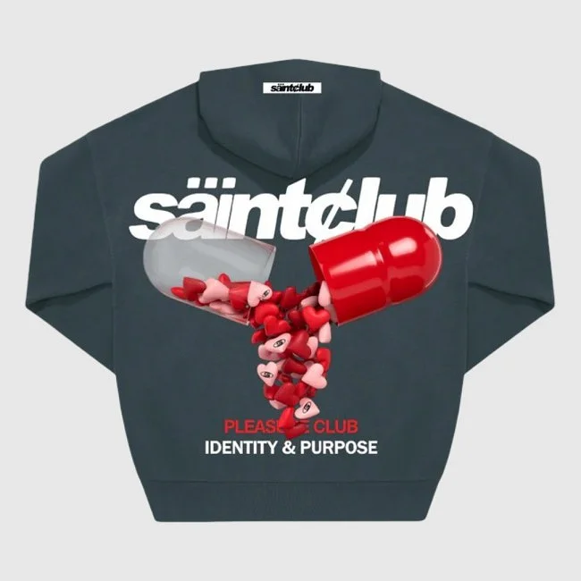 Sudadera con capucha de Saint Dept. con diseño gráfico de cápsula en la parte trasera, de la que emergen corazones y logotipos, acompañada del lema Identity & Purpose. En el frente, destaca el logo con un gráfico de estrella dinámica. Con ajuste relajado y bolsillo tipo canguro, esta prenda fusiona estilo urbano con un mensaje visual impactante.