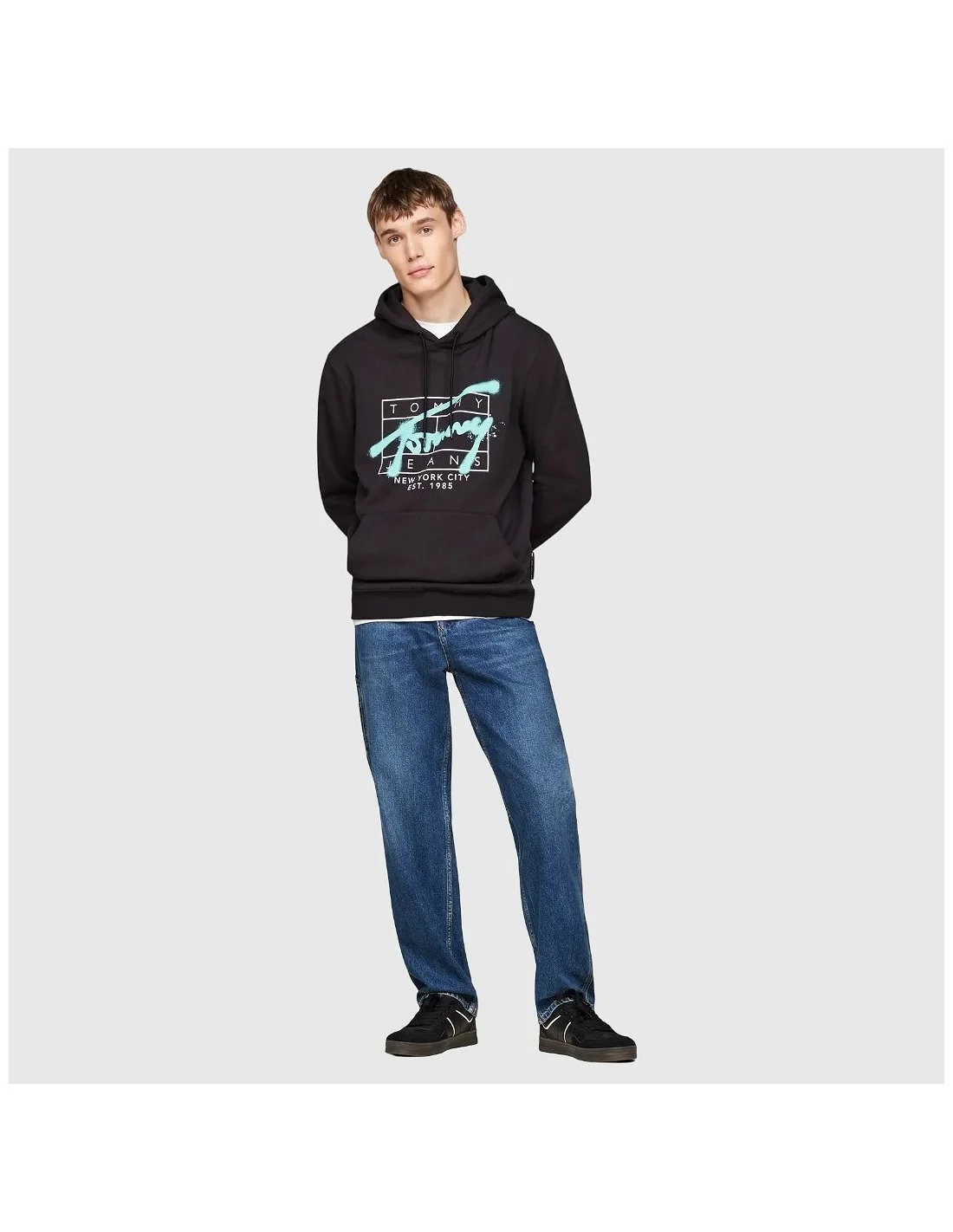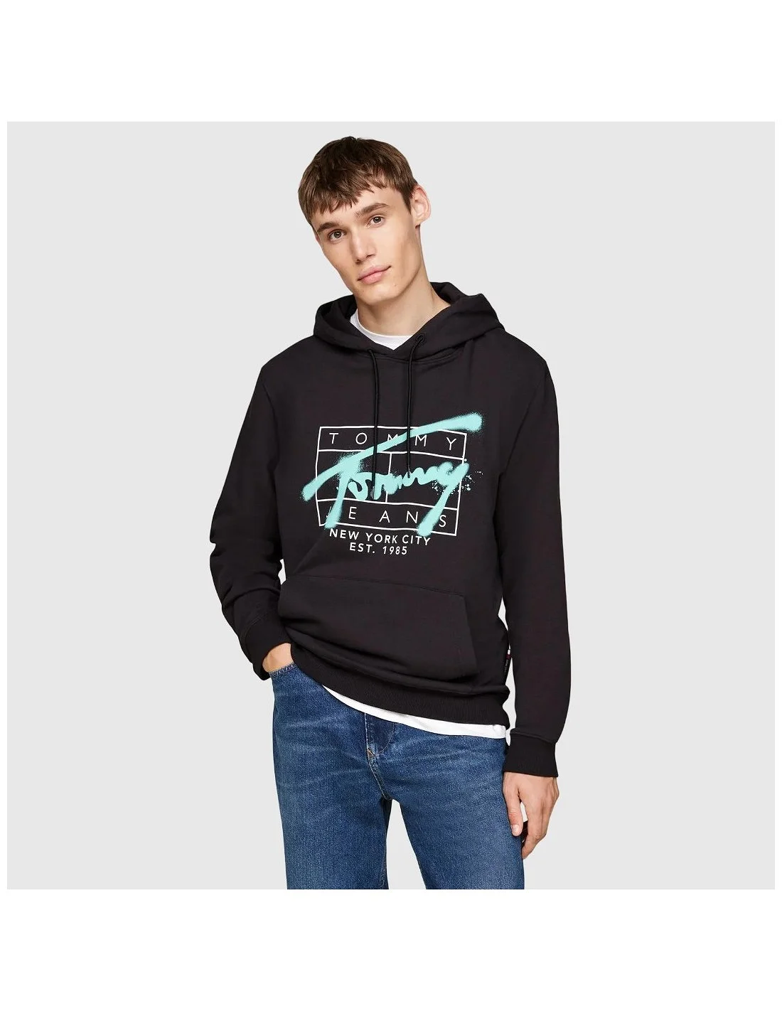 Sudadera Tommy Hilfiger con capucha ajustable mediante cordones y bolsillo tipo canguro en la parte frontal. Presenta un gran estampado gráfico con el logotipo de la marca y texto decorativo en el pecho. Puños y dobladillo acanalados que aportan un ajuste cómodo y un acabado moderno para un estilo casual.